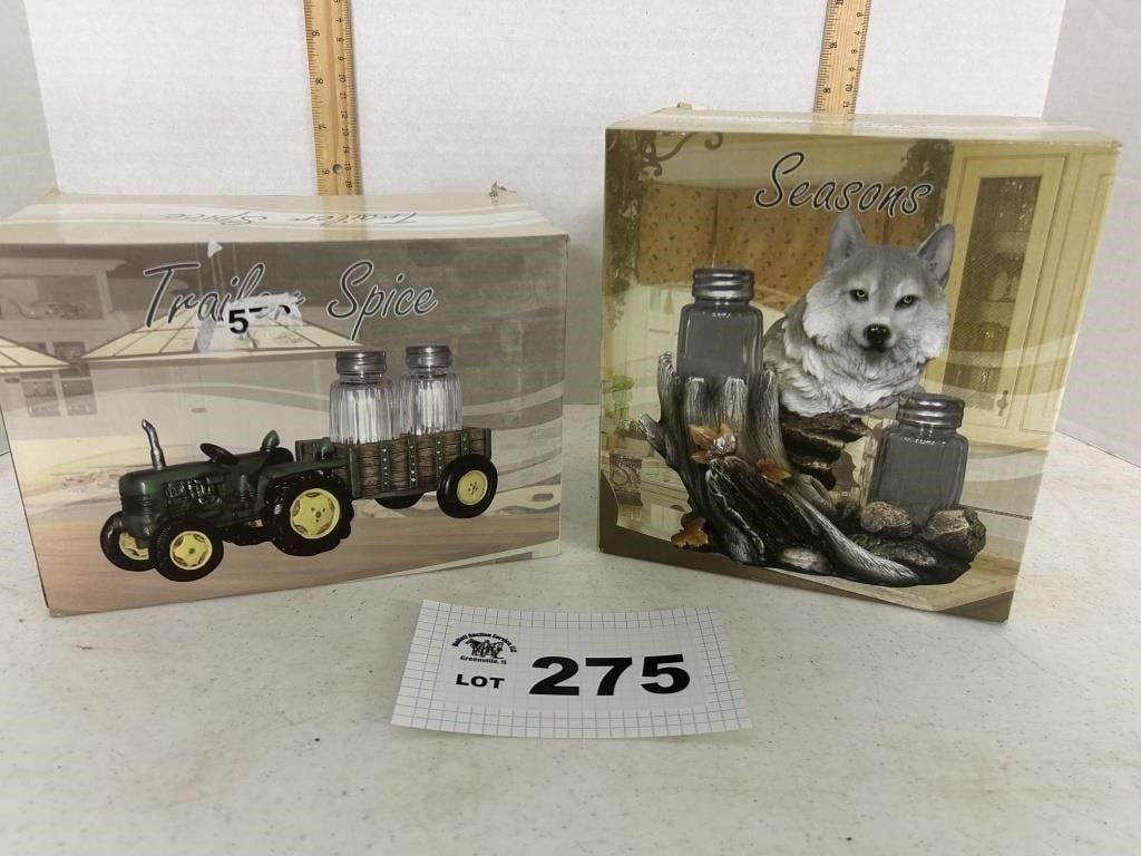 TRACTOR AND WOLF SALT AND PEPPER SETS