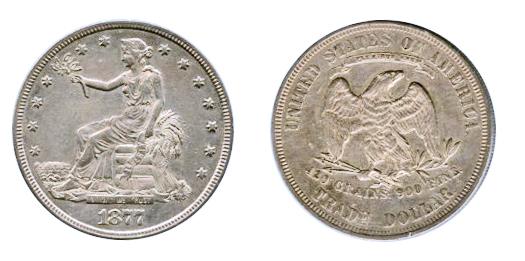 TRADE DOLLAR. 1877. Extra Fine-40. Brilliant.