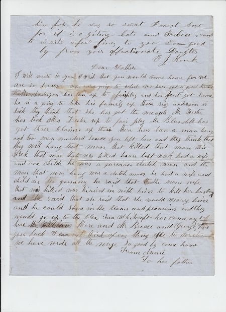 Good content A.L.S., 3pp. 4to., Denver, June 23, 1860 in which C. D. Ronk and her daughters write to her husband, D. T. Ronk. In part: "...our babe is dead he died May the 30 he suffered more than I can tell his last sickness was digestion on the brain...I had to lay the darling little one out and put him in the coffin myself there was no men to bury him till the minister went out and got some men...we are very unpleasantly situated here...I have three borders they pay seven dollars a week. I expect to buy a cow in the morning...". The daughter adds: "...little David has left us he has gone home where no pane nor sorrow can enter in...". Finally, the second daughter writes: "...Susie Anderson is sick they think she has the measles...there has been a man hung and two men murdered since you left and they think that they will hang that man that killed that man this week...the man that was hung was a dutch man he had a wife and a child...the man's wife that was killed was kinived in with him to kill her husband...So good bye come home...". One can only imagine the reader's reactions! Very good.