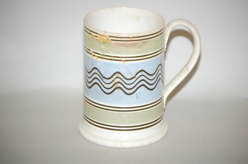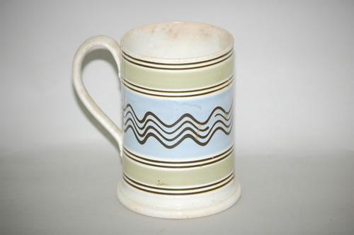 TRAILING LINES MOCHAWARE TANKARD - 6" BANDED CREAMWARE MOCHA TANKARD W/ A WIDE BLUE BAND W/ 4 BROWN TRAILING PARALLEL LINES, UPPER & LOWER GREEN BANDS & 4 PAIRS OF THIN BROWN LINE SEPARATORS (6" T X 6" W W/ HANDLE)- FLAKING, CRAZING, STAIN, IMPERFECTIONS