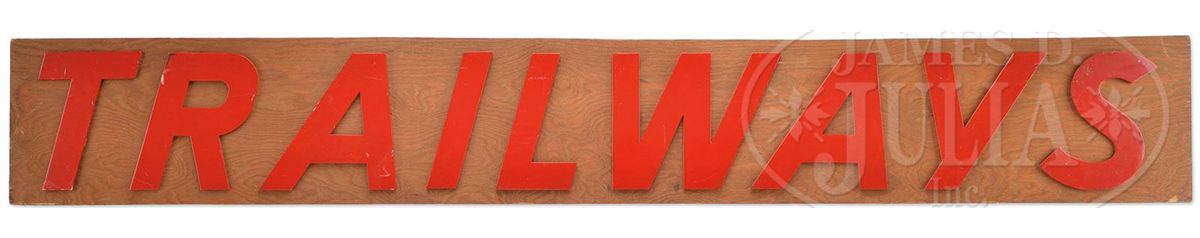 Large wooden bus station sign consisting of red cutout letters on stained plywood background. SIZE: 84" l x 12" h. CONDITION: Very good with a few scuffs to letters. 1-13216