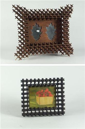 TRAMP/FOLK ART: Two tramp folk art frames. The first features a multi-layered lattice work construction with a central leaf motif over a mirrored back. Measures 20'' x 18'' x 3'', some points and parts to lattice missing, as seen. The second smaller frame also features a multi-layered notched lattice construction with a dark brown stain housing a small oil painting of a strawberry basket. Measures 10 1/2'' x 9 1/4'' x 2 1/4''.