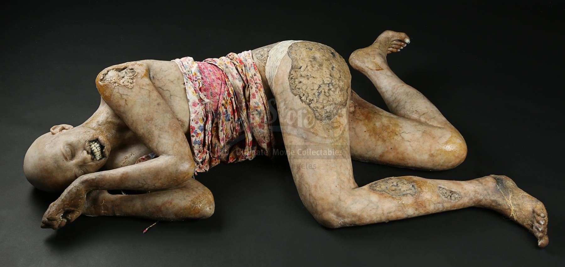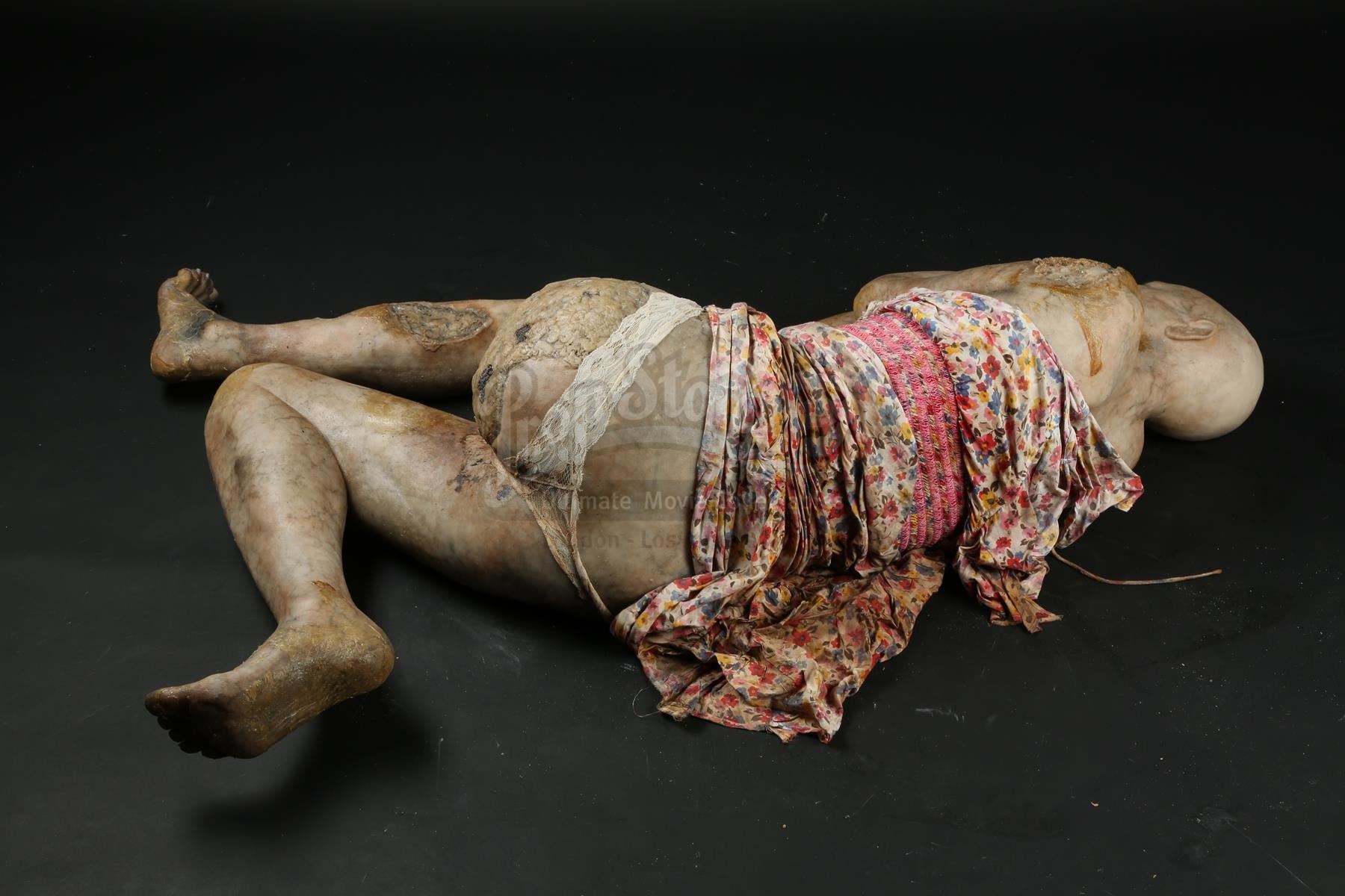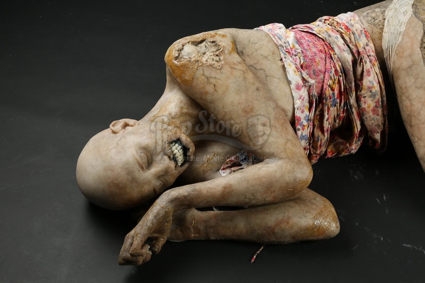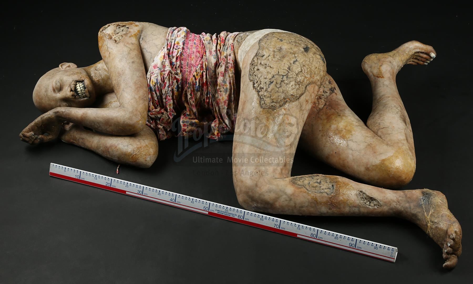 Made from silicone, the body was cast from the actress Tuppence Middleton and displays great detail to give the effect of extensive decay. The teeth are resin, the nails are made of plastic, and there are punched eyebrows and eyelashes for added realism. The body is dressed in a heavily soiled floral dress, with an accompanying pair of distressed leather sandals. A metal armature runs throughout the body for support and rigidity, and it has been weighted, with the limbs stuck together to ensure a consistent pose. Heavily distressed by the production, the body remains in very good condition. Dimensions: 135 cm x 56 cm x 34 cm (53 1/4'' x 22'' x 13 1/4'')
