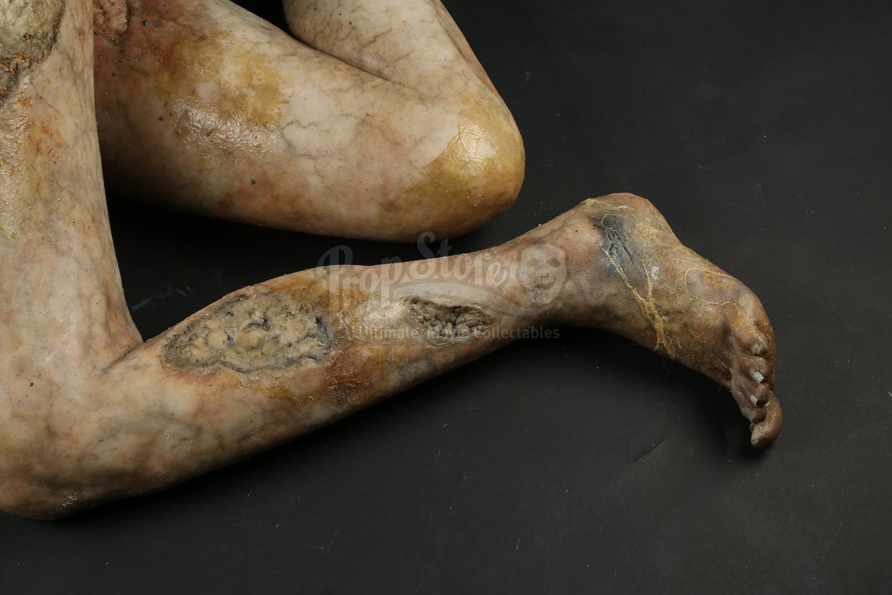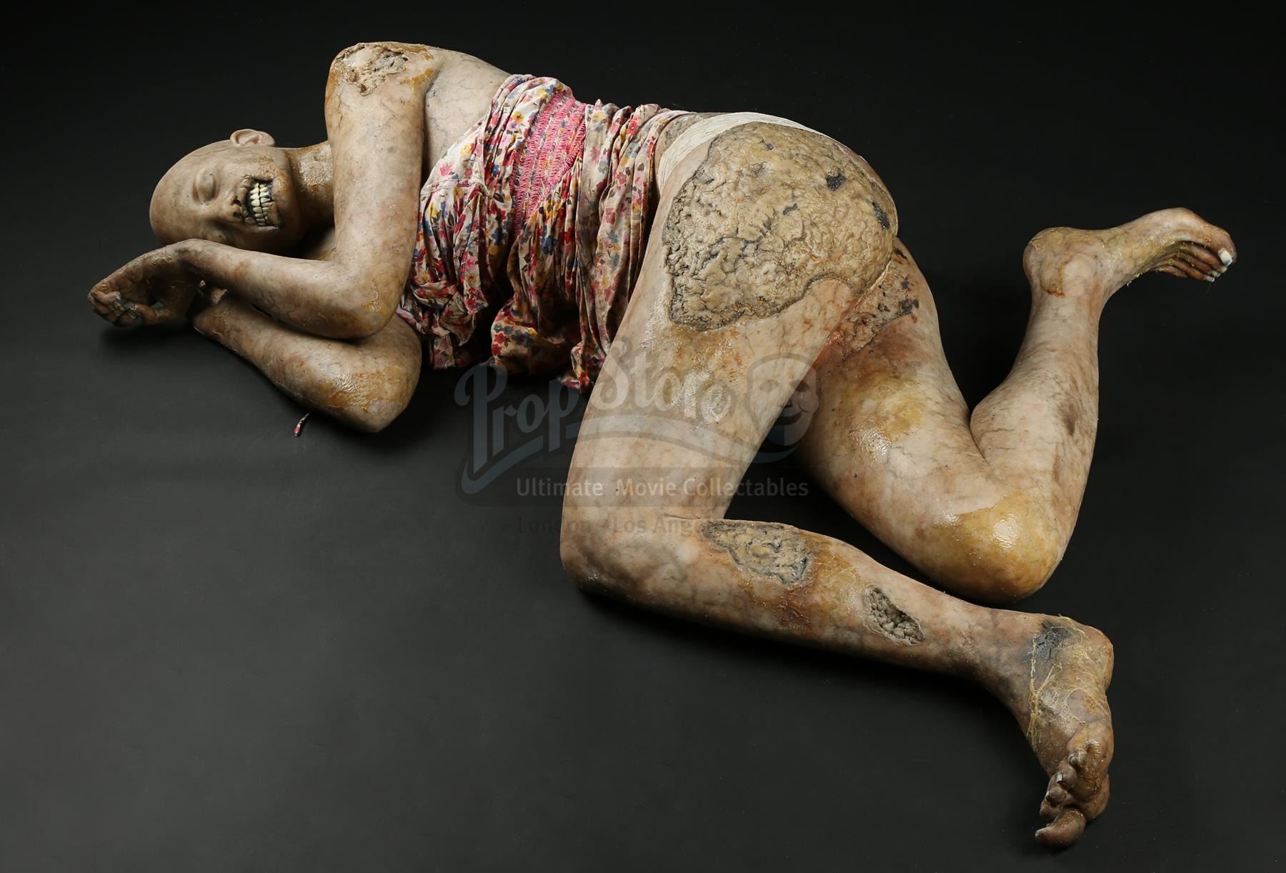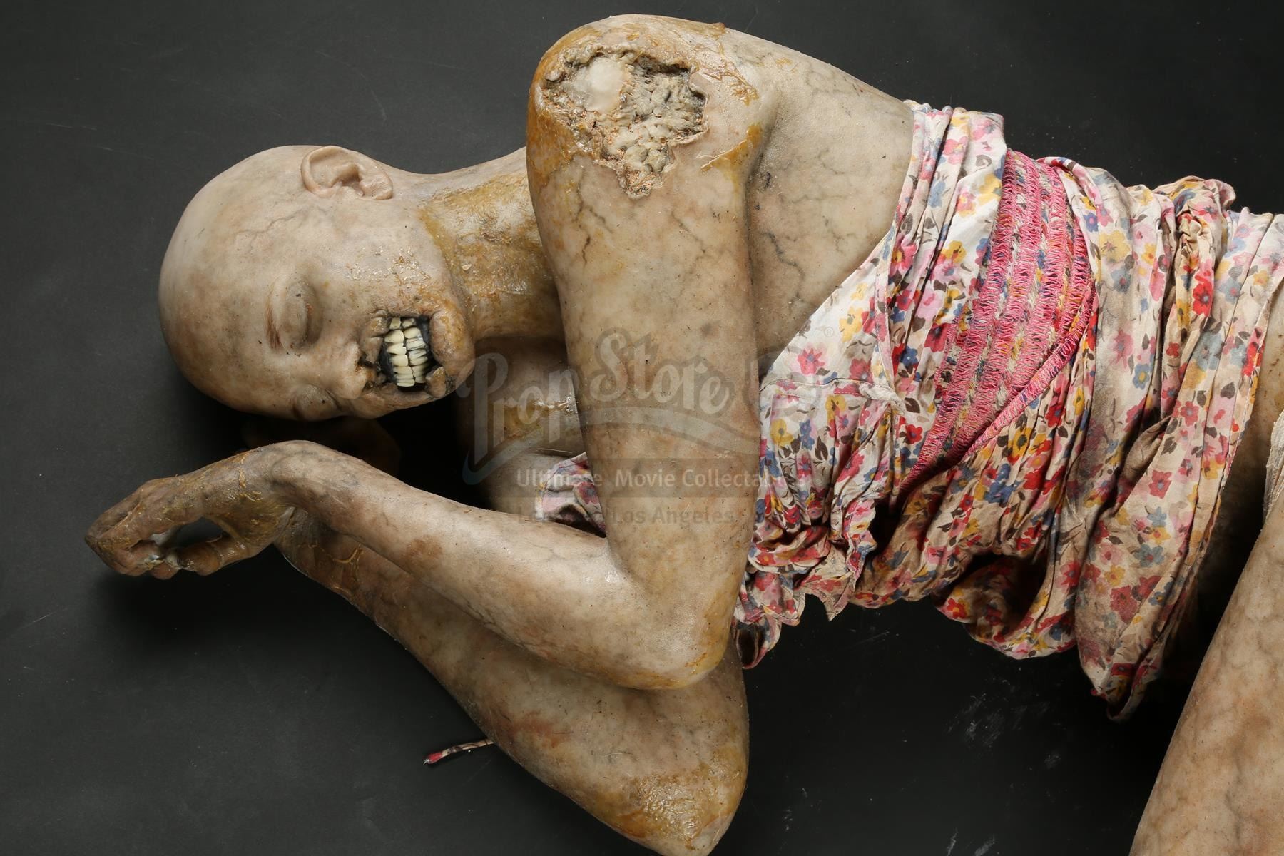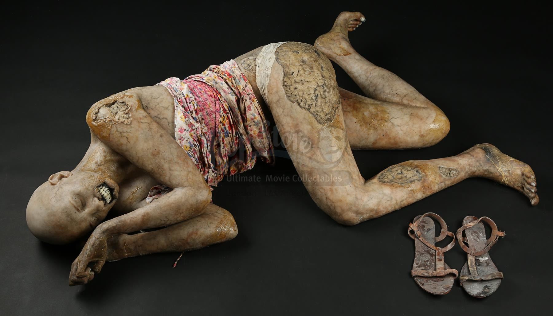 Made from silicone, the body was cast from the actress Tuppence Middleton and displays great detail to give the effect of extensive decay. The teeth are resin, the nails are made of plastic, and there are punched eyebrows and eyelashes for added realism. The body is dressed in a heavily soiled floral dress, with an accompanying pair of distressed leather sandals. A metal armature runs throughout the body for support and rigidity, and it has been weighted, with the limbs stuck together to ensure a consistent pose. Heavily distressed by the production, the body remains in very good condition. Dimensions: 135 cm x 56 cm x 34 cm (53 1/4'' x 22'' x 13 1/4'')