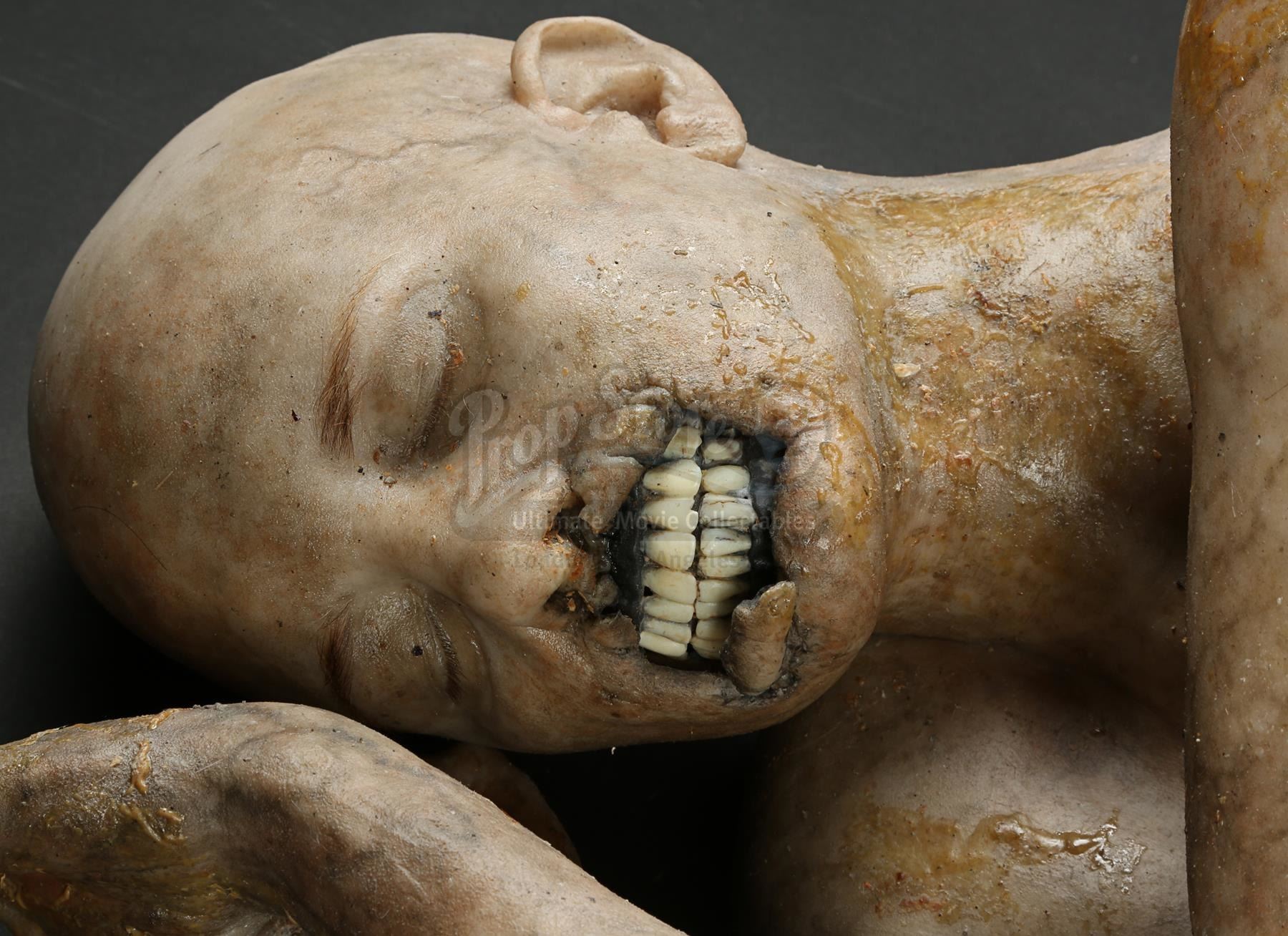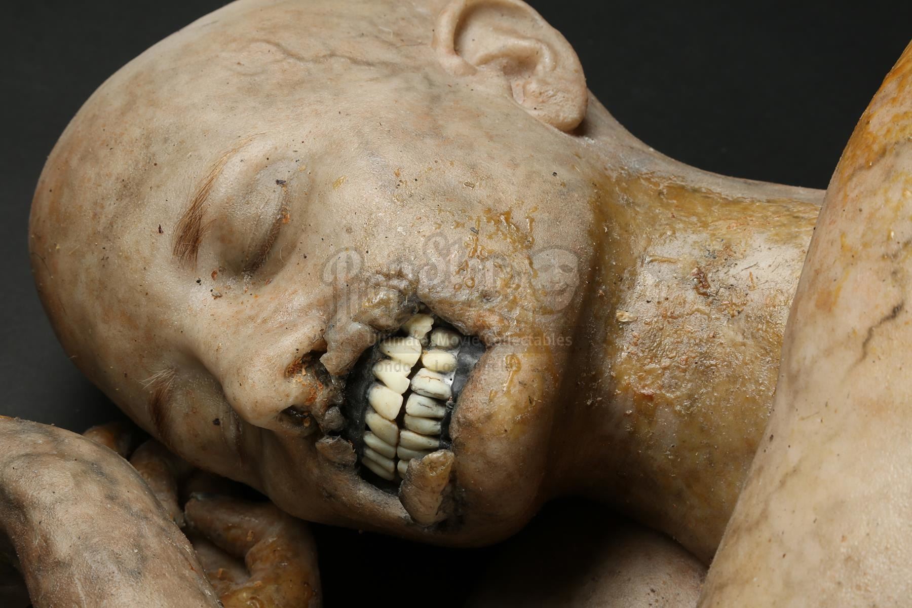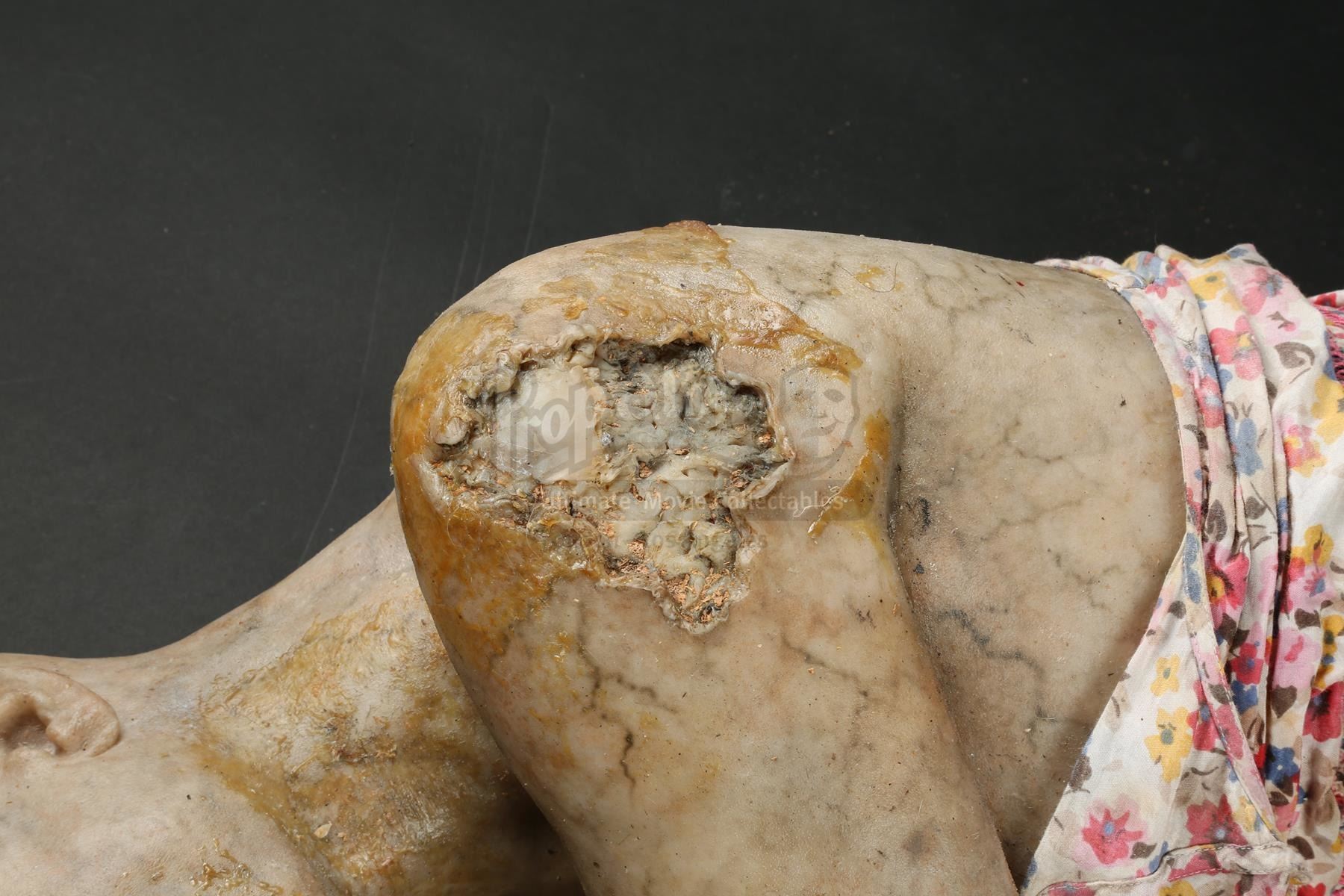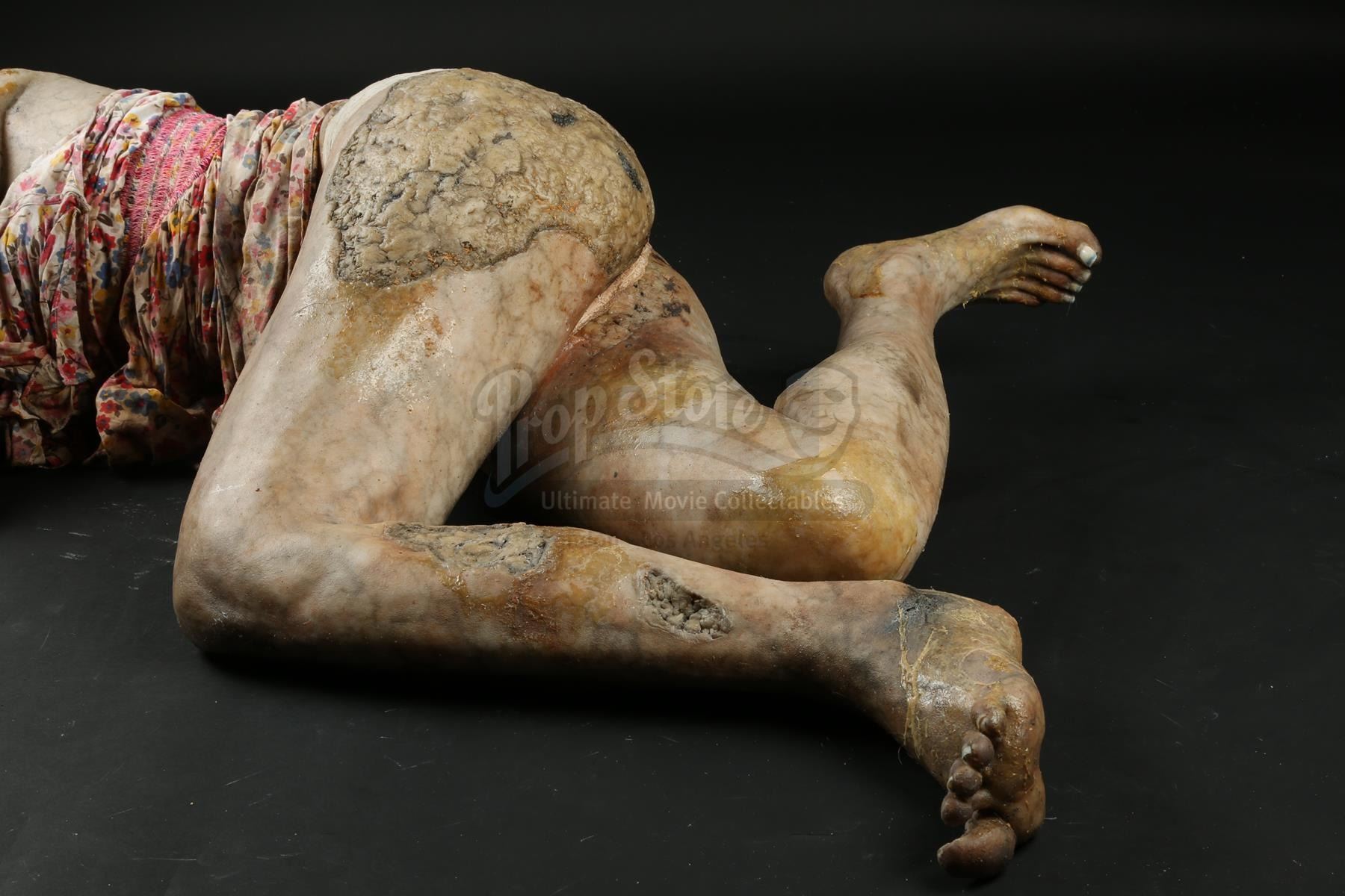Made from silicone, the body was cast from the actress Tuppence Middleton and displays great detail to give the effect of extensive decay. The teeth are resin, the nails are made of plastic, and there are punched eyebrows and eyelashes for added realism. The body is dressed in a heavily soiled floral dress, with an accompanying pair of distressed leather sandals. A metal armature runs throughout the body for support and rigidity, and it has been weighted, with the limbs stuck together to ensure a consistent pose. Heavily distressed by the production, the body remains in very good condition. Dimensions: 135 cm x 56 cm x 34 cm (53 1/4'' x 22'' x 13 1/4'')