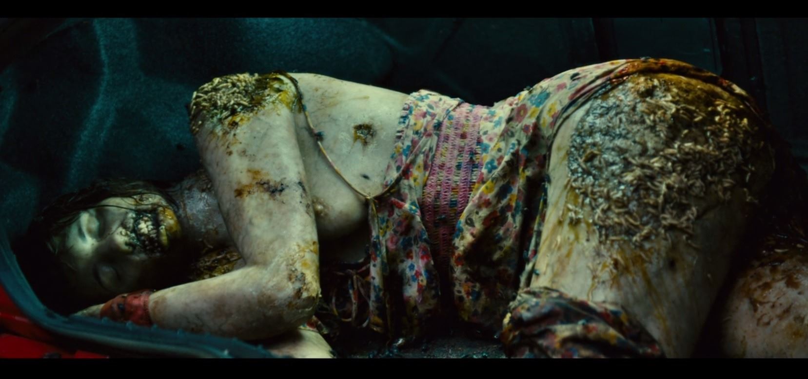 A decayed full-size female body from Danny Boyle's crime drama Trance. A young woman's body was found in the boot of a car, after Simon (James McAvoy) strangled her, having mistaken her for Elizabeth (Rosario Dawson).