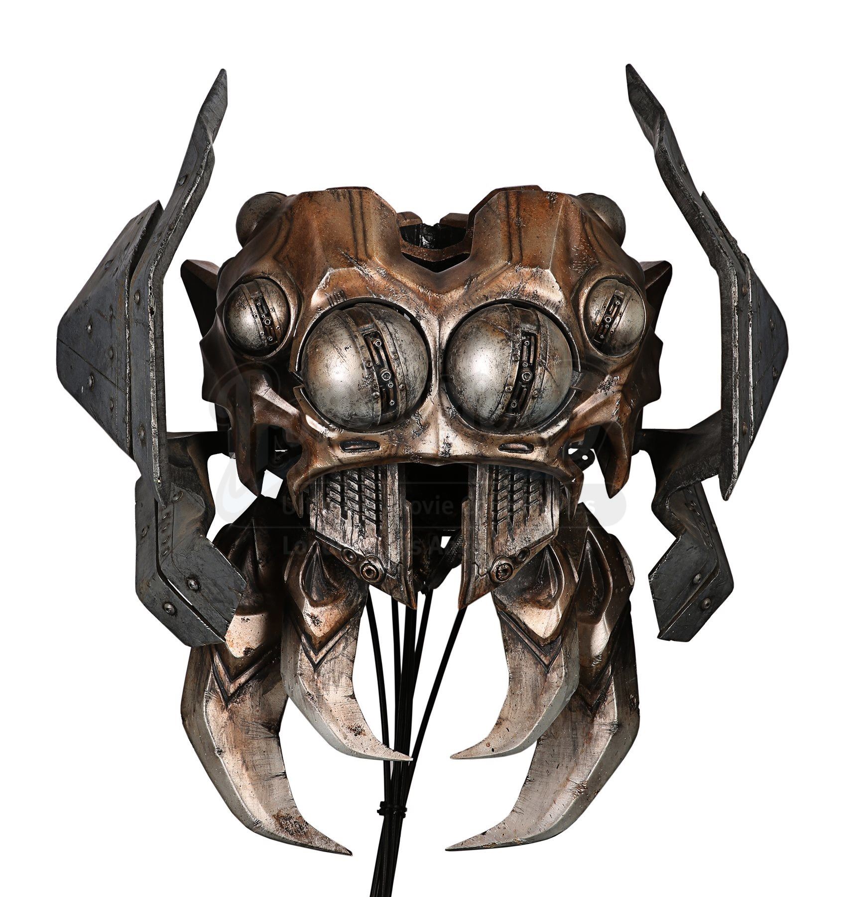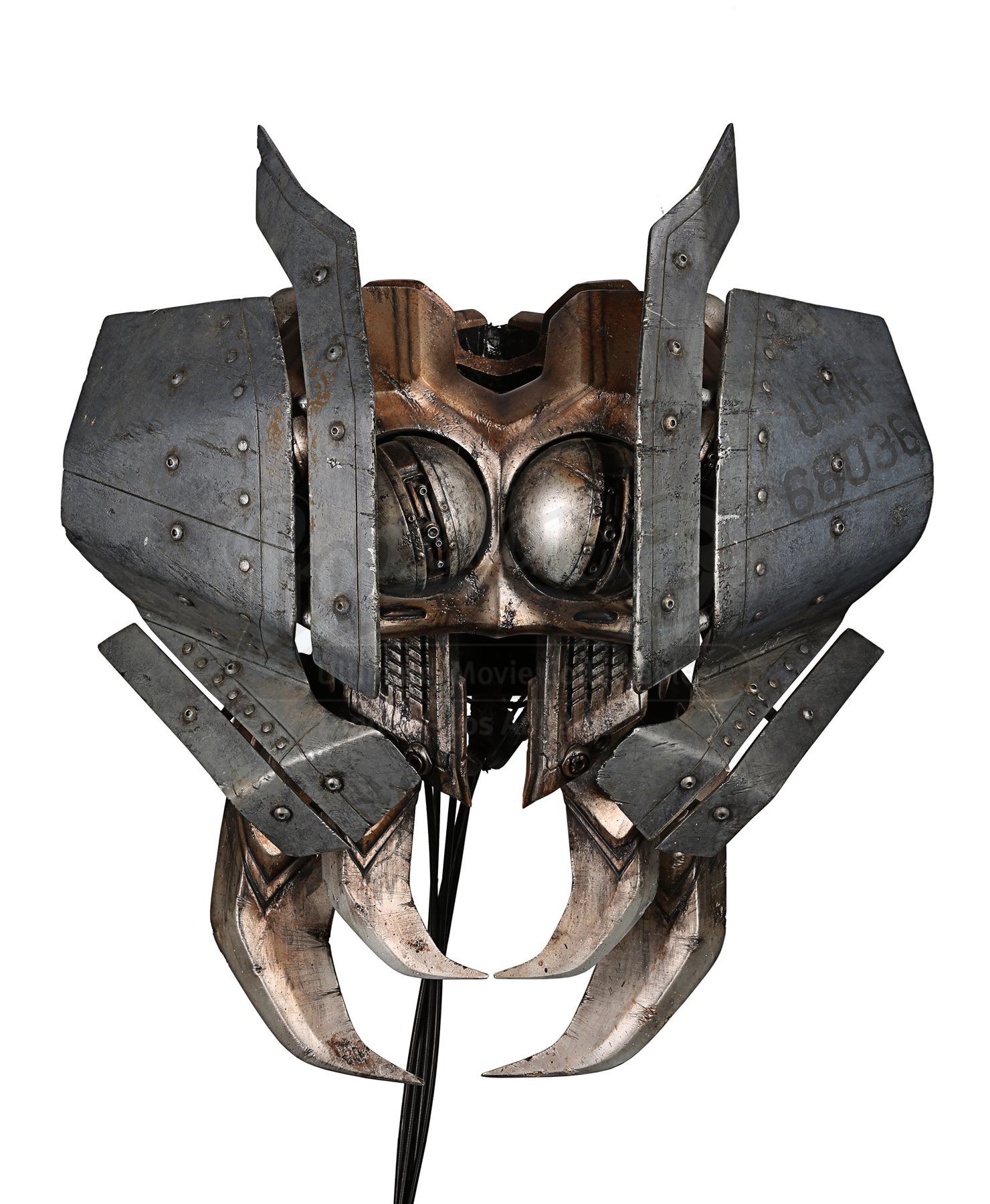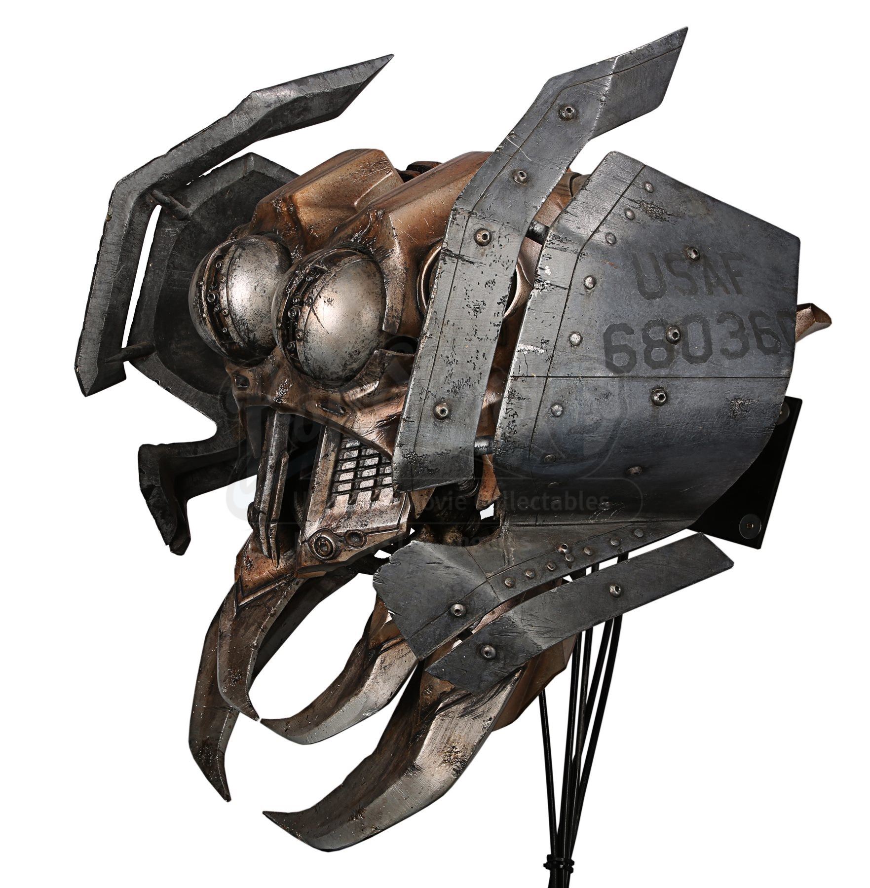 An animatronic Scorponok head from Michael Bay’s sci-fi adventure Transformers. During Blackout’s attack on the US SOCCENT Forward Operations Base in Qatar, his symbiotic counterpart Scorponok was ejected. As the surviving soldiers trekked through the desert to safety, the Decepticon stalked the unit, eventually ambushing them outside a small Bedouin village. The arachnoid robot was brought to life on screen almost entirely using CGI; the only physical components made were the head and tail, built and operated by the talented crew at KNB EFX. It screen-matches to the moment when it raised its head above the sand to spy on the soldiers.