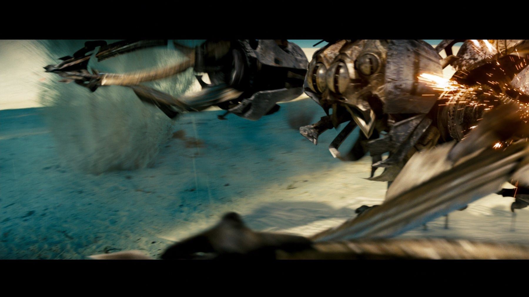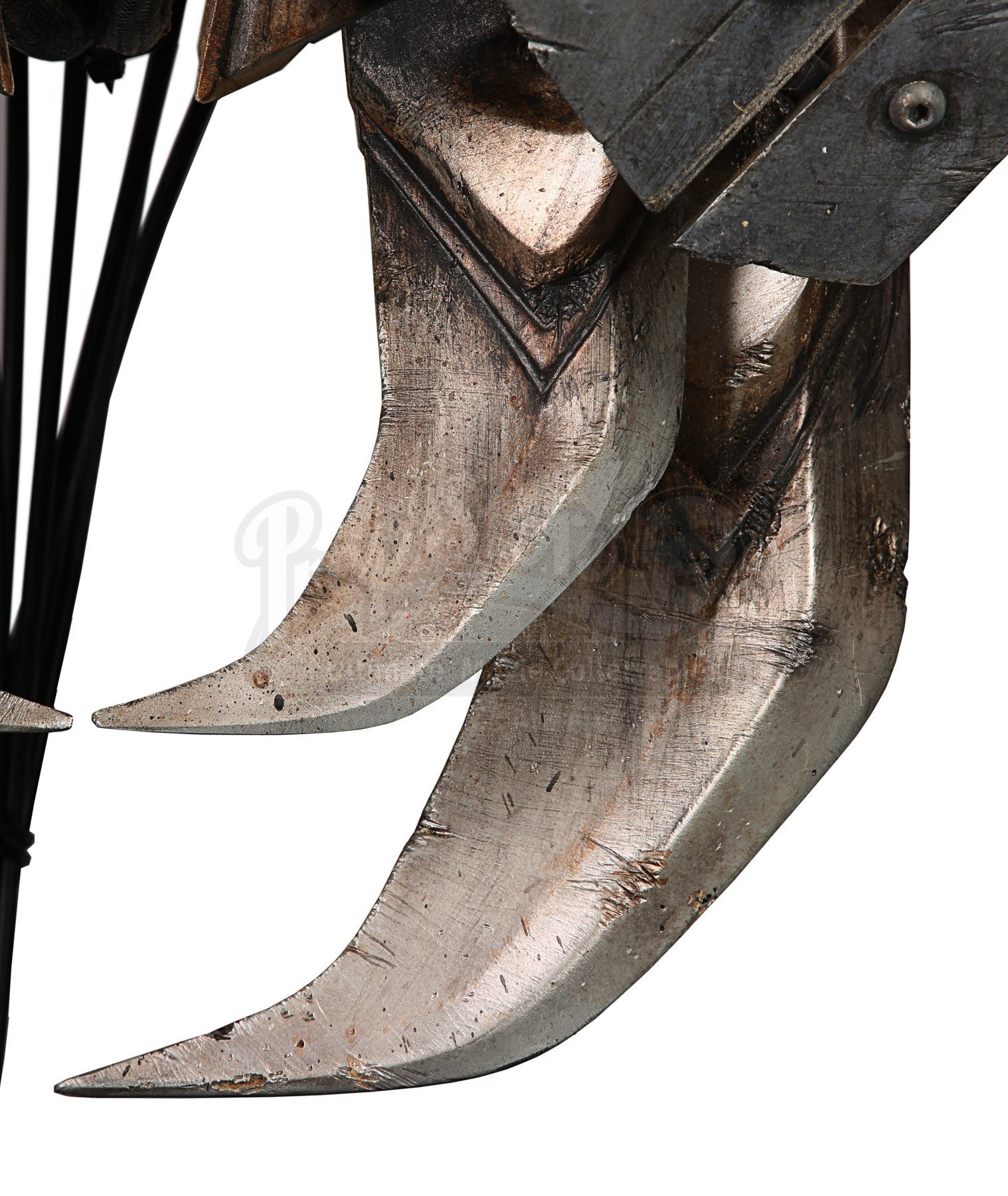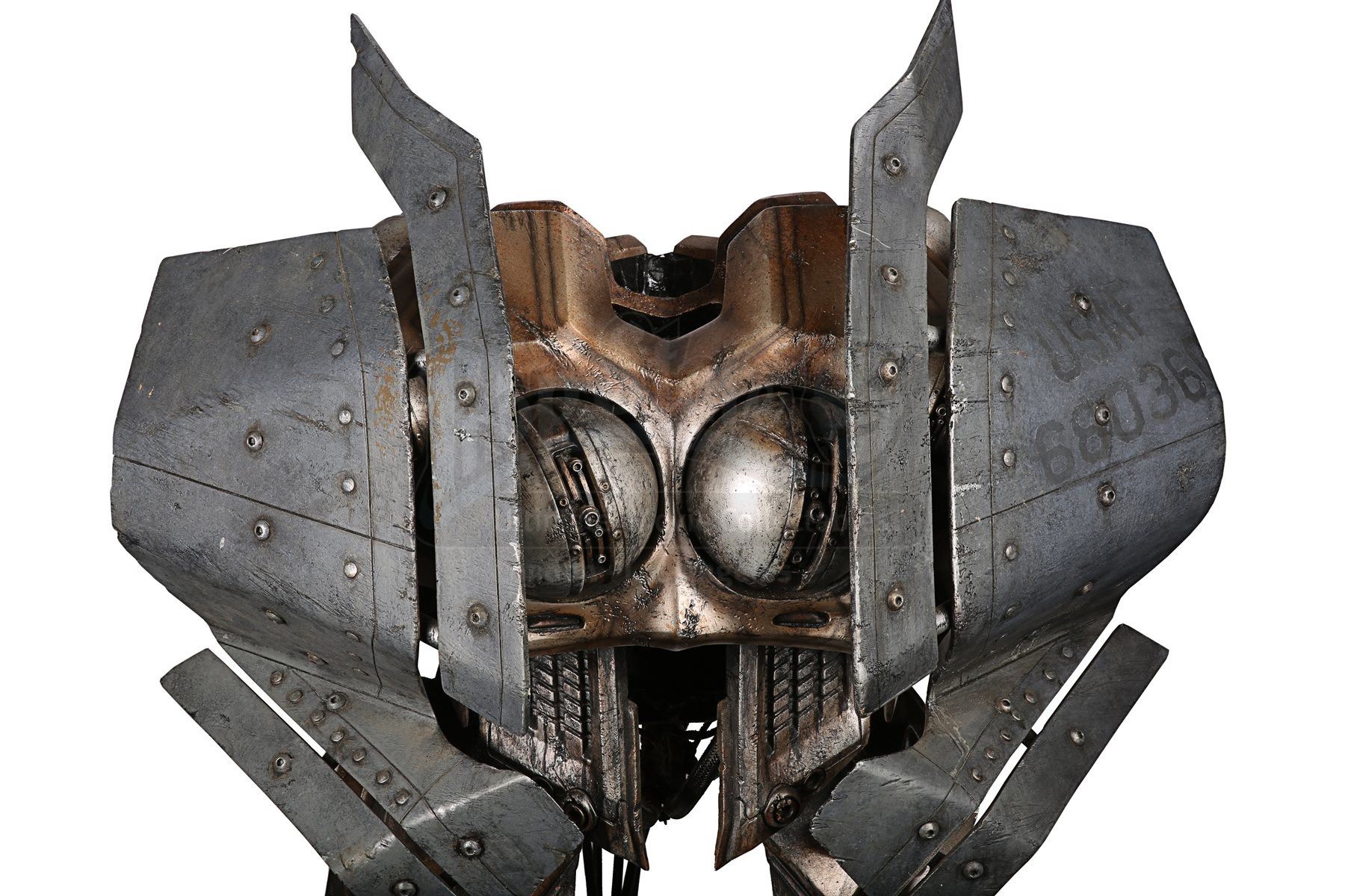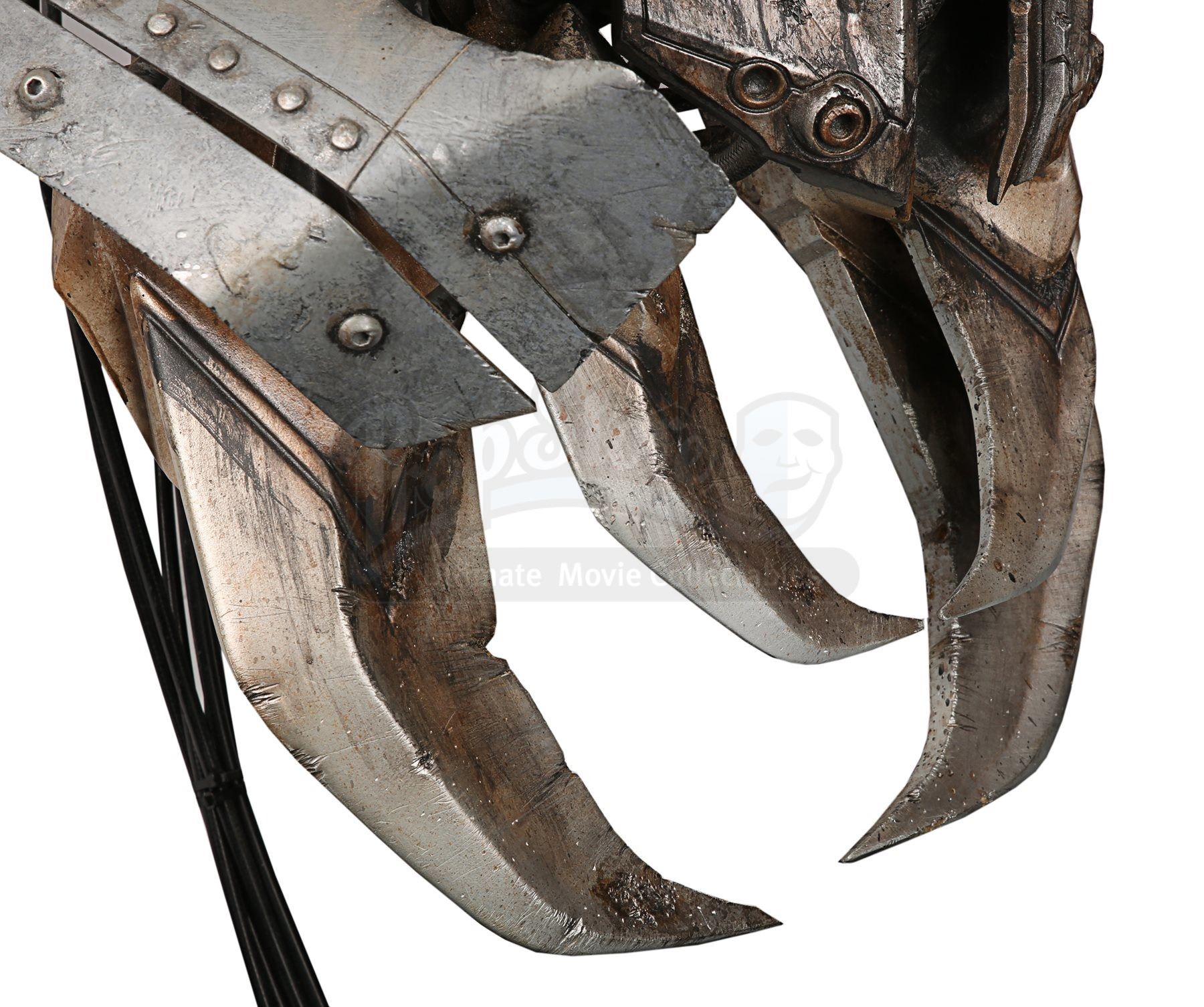 An animatronic Scorponok head from Michael Bay’s sci-fi adventure Transformers. During Blackout’s attack on the US SOCCENT Forward Operations Base in Qatar, his symbiotic counterpart Scorponok was ejected. As the surviving soldiers trekked through the desert to safety, the Decepticon stalked the unit, eventually ambushing them outside a small Bedouin village. The arachnoid robot was brought to life on screen almost entirely using CGI; the only physical components made were the head and tail, built and operated by the talented crew at KNB EFX. It screen-matches to the moment when it raised its head above the sand to spy on the soldiers.