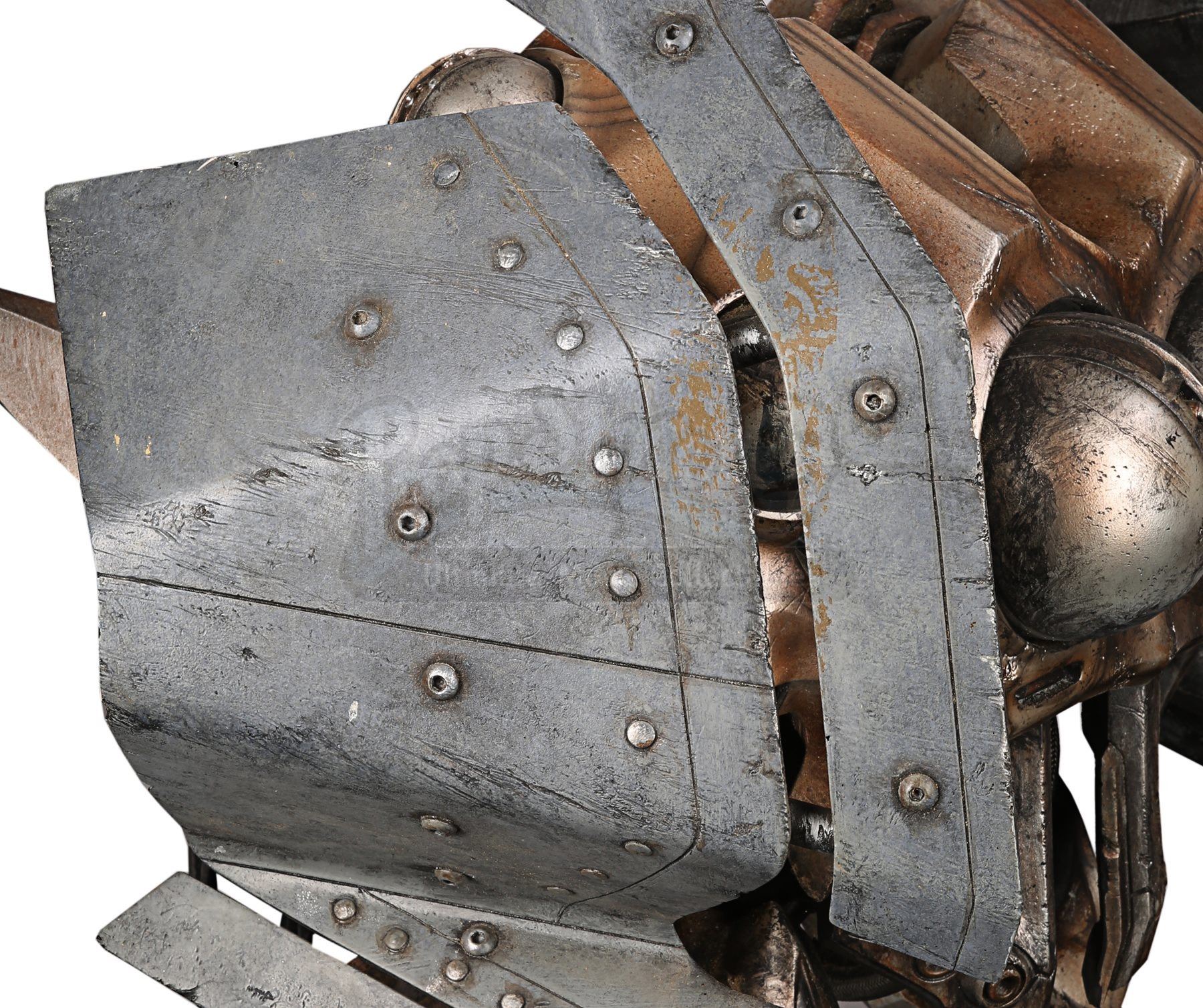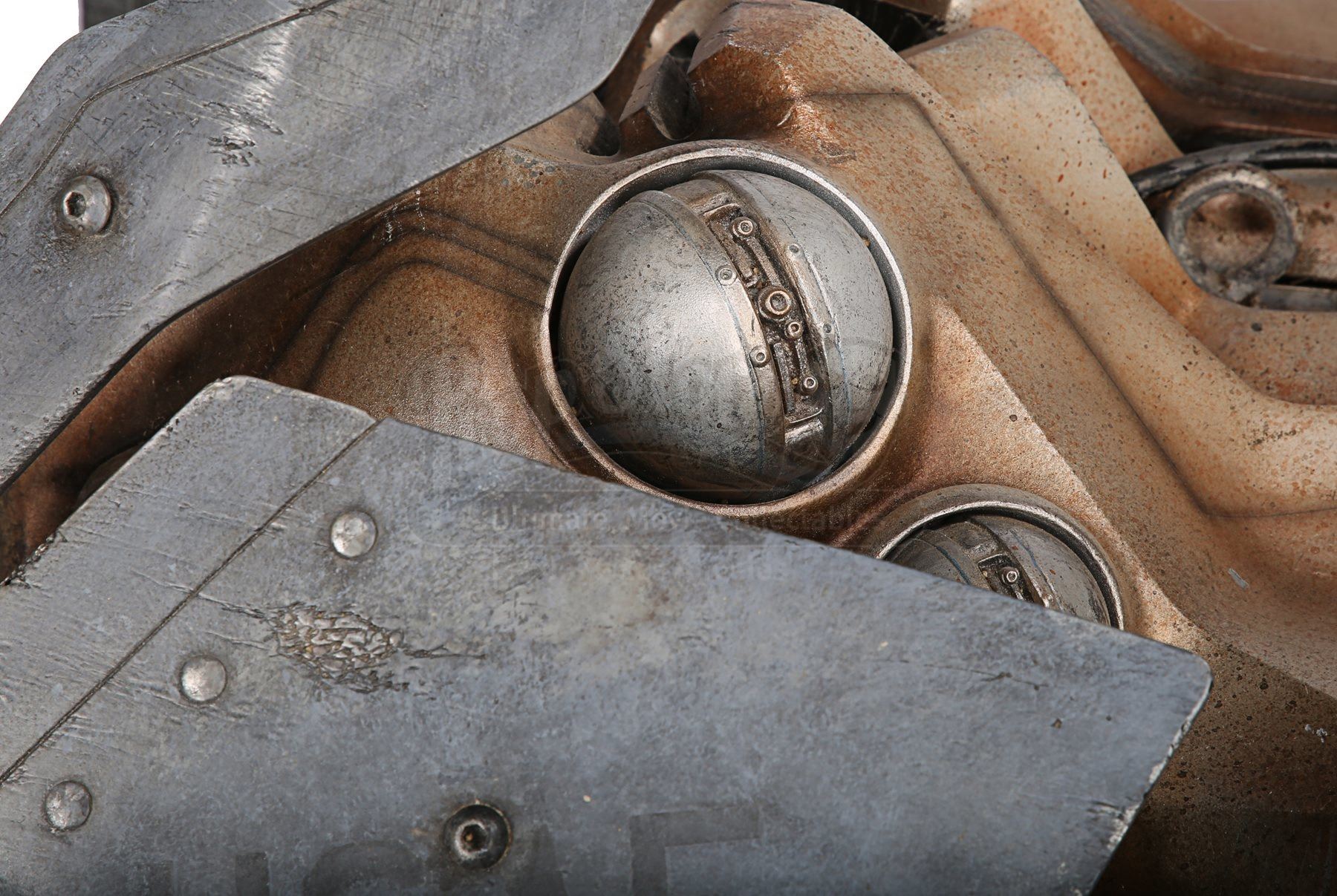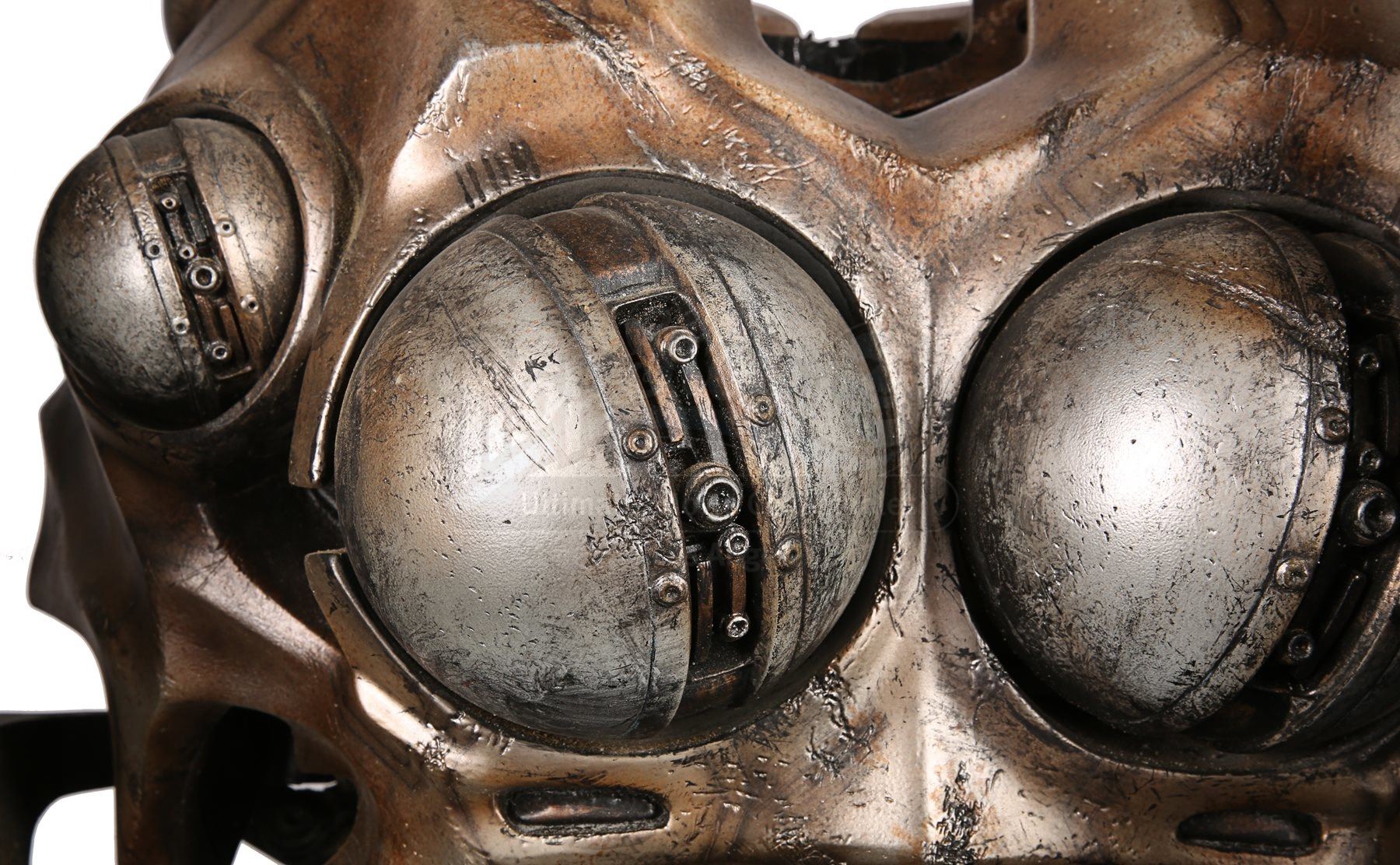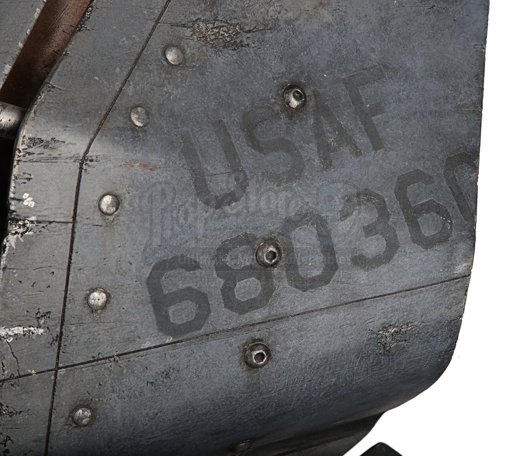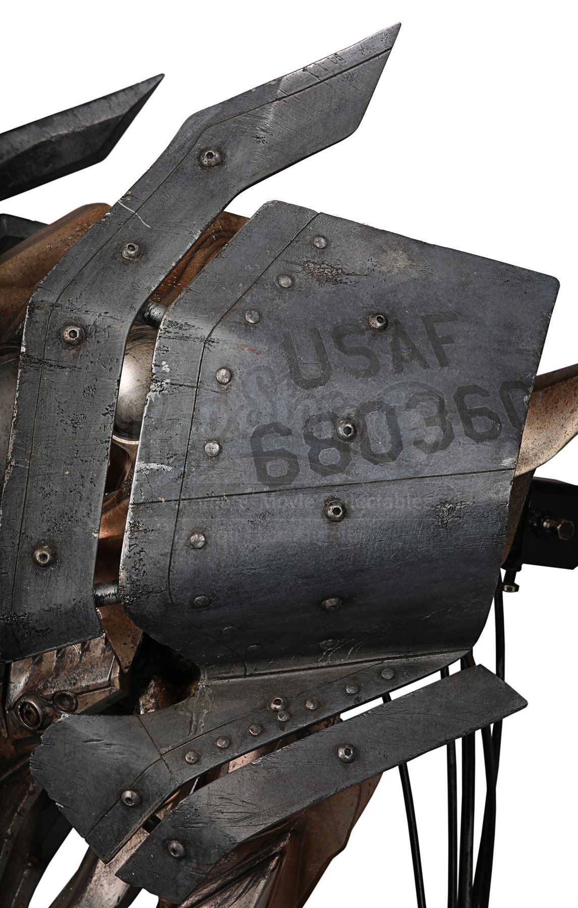 It is painted metallic grey and faux bronze, with black accents and splatter effect to add to the aged appearance. “USAF 680360” is stencilled in black paint on the left panel. Sand from the desert film set is still present, and a patch of gaffer tape is adhered to the top of the head, likely to achieve the trickling sand effect when the robot emerged from the ground. The piece remains in very good condition, with a custom-made mounting point to attach it to a secure wall surface. Dimensions: 68 cm x 60 cm x 71 cm (26” x 23” x 28”)