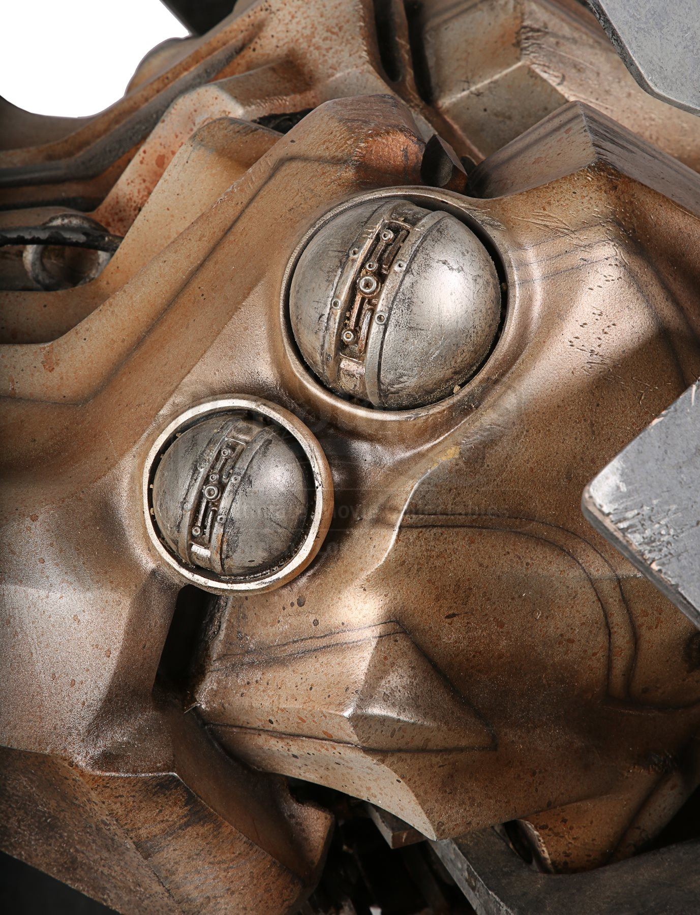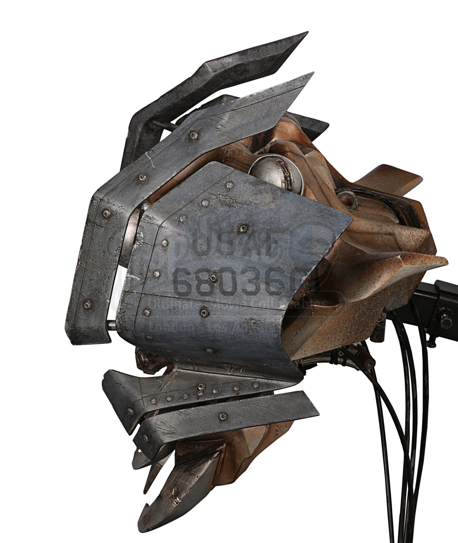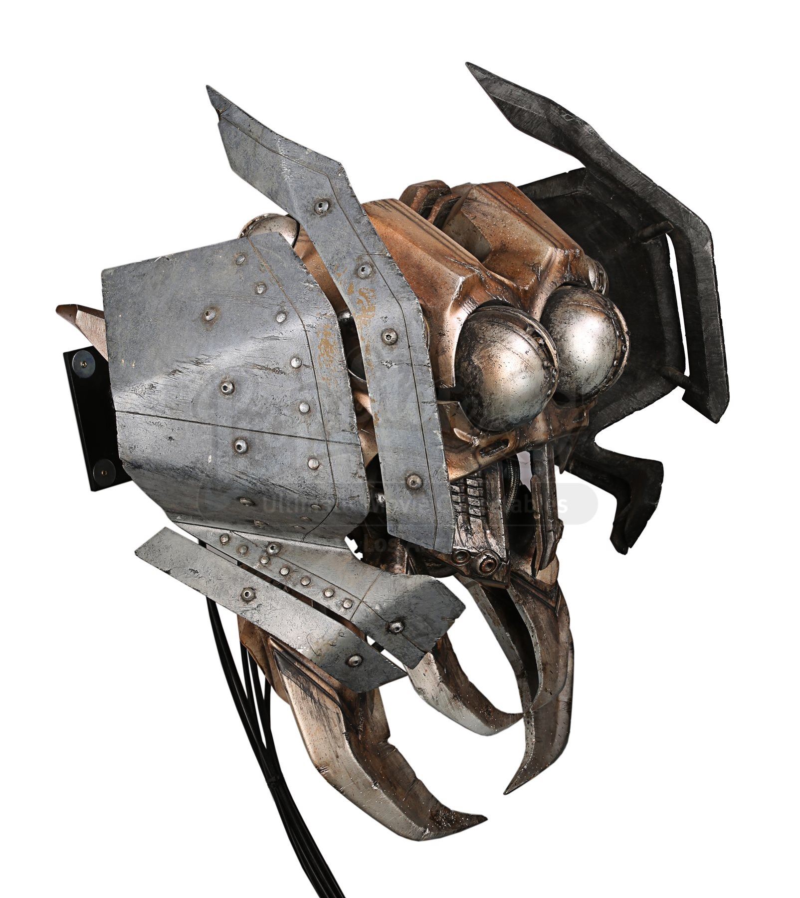 The head is constructed around a steel frame, with assorted hinges, springs and supports, and includes a variety of moving parts controlled with cables: two side panels can move in and out independently; a set of small and large mandibles can be made to pinch together; and the large forward-facing eyes can twitch left and right. Covering the surface are fibreglass panels decorated with rivets, scuffs and other distressed effects to make it appear battle-worn.