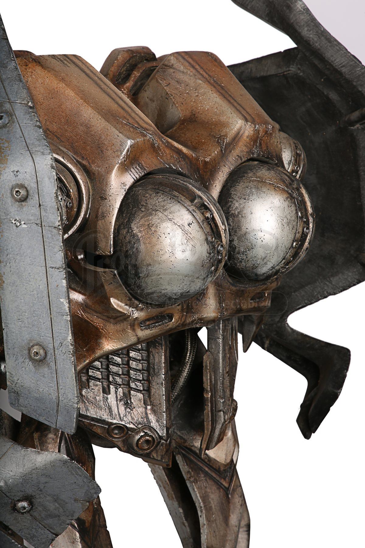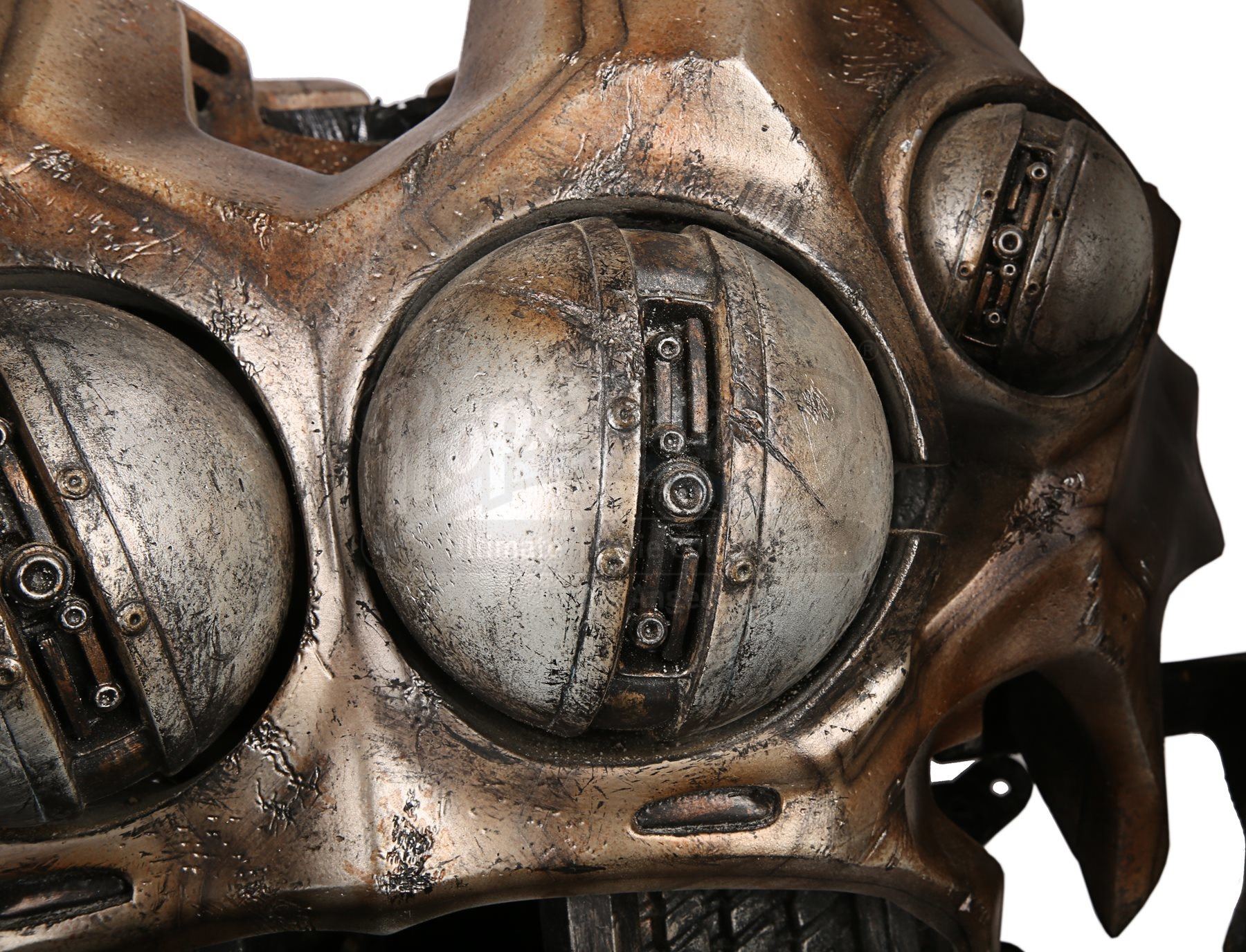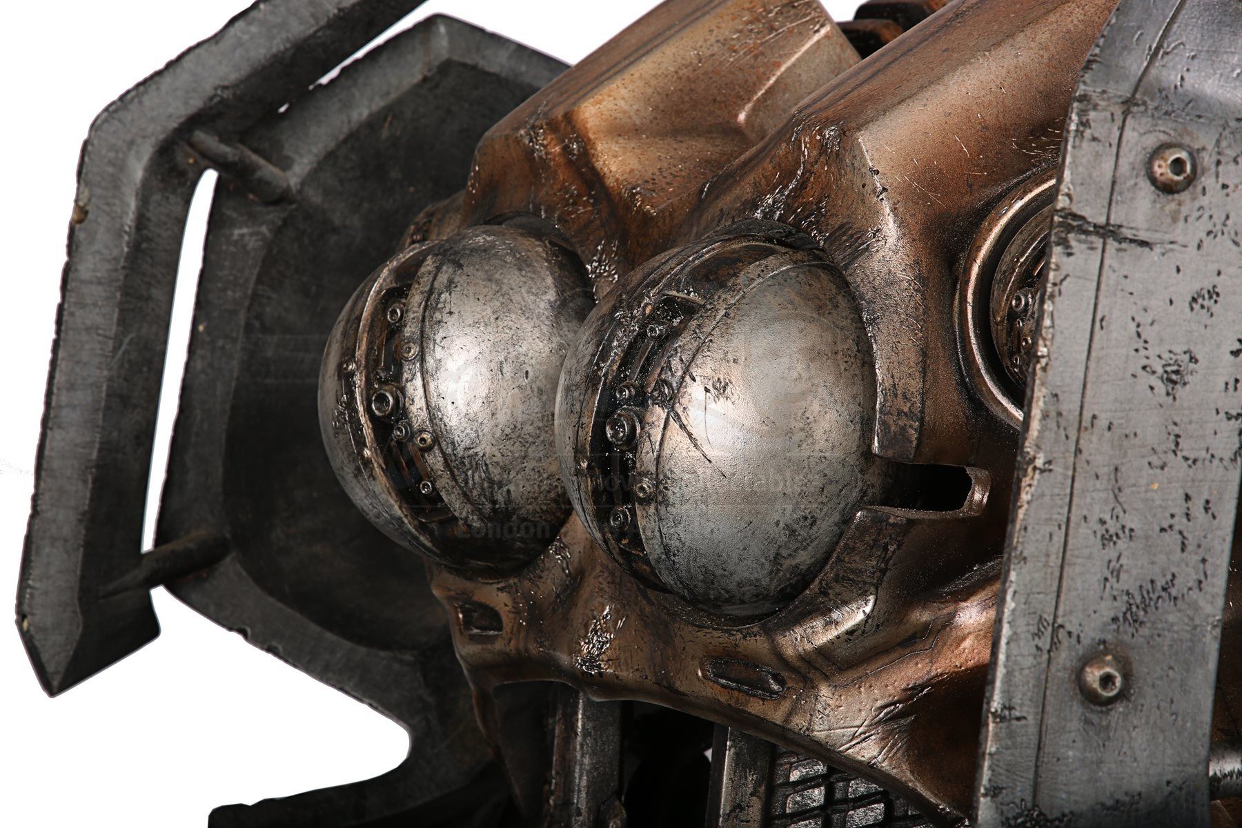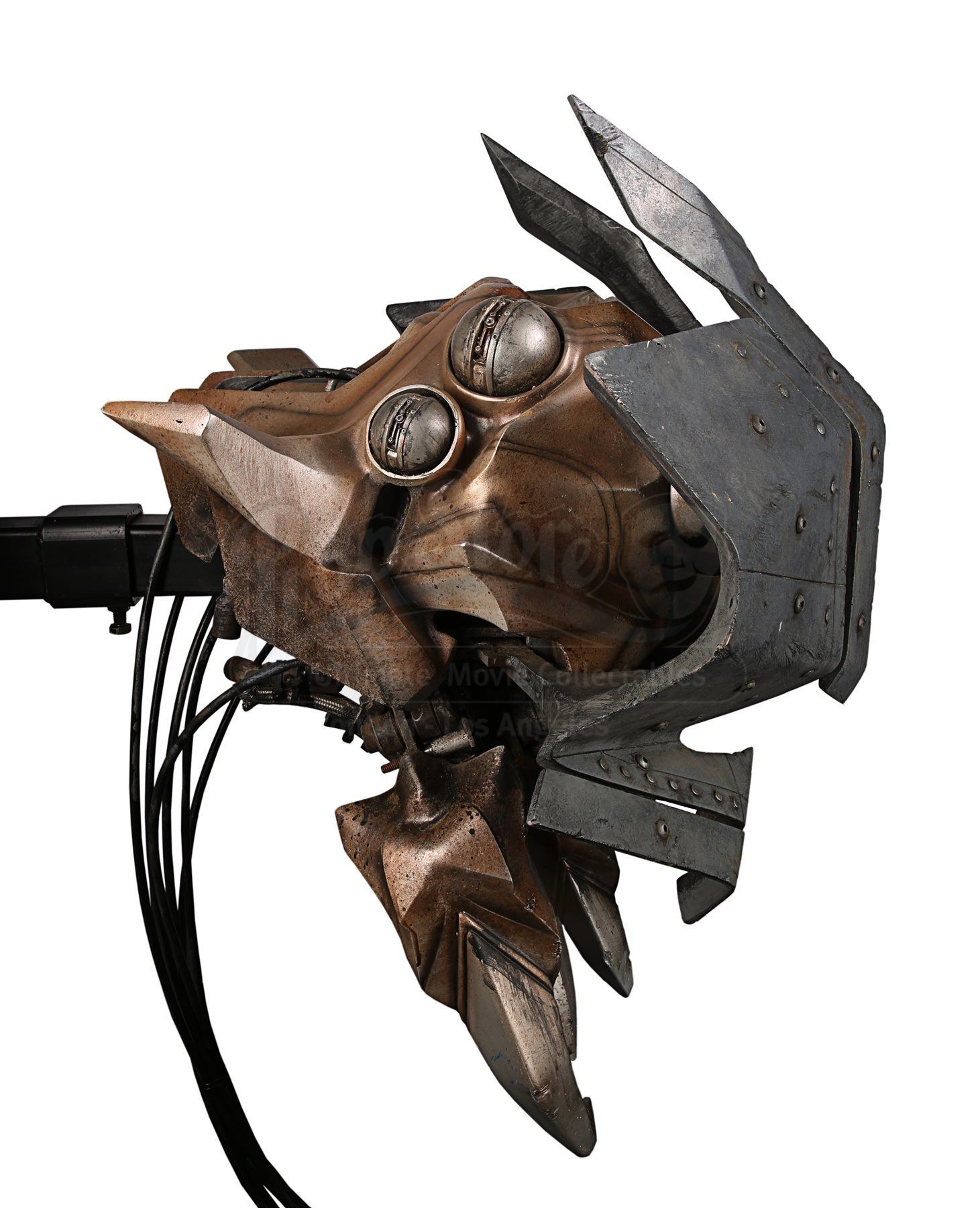 The head is constructed around a steel frame, with assorted hinges, springs and supports, and includes a variety of moving parts controlled with cables: two side panels can move in and out independently; a set of small and large mandibles can be made to pinch together; and the large forward-facing eyes can twitch left and right. Covering the surface are fibreglass panels decorated with rivets, scuffs and other distressed effects to make it appear battle-worn.