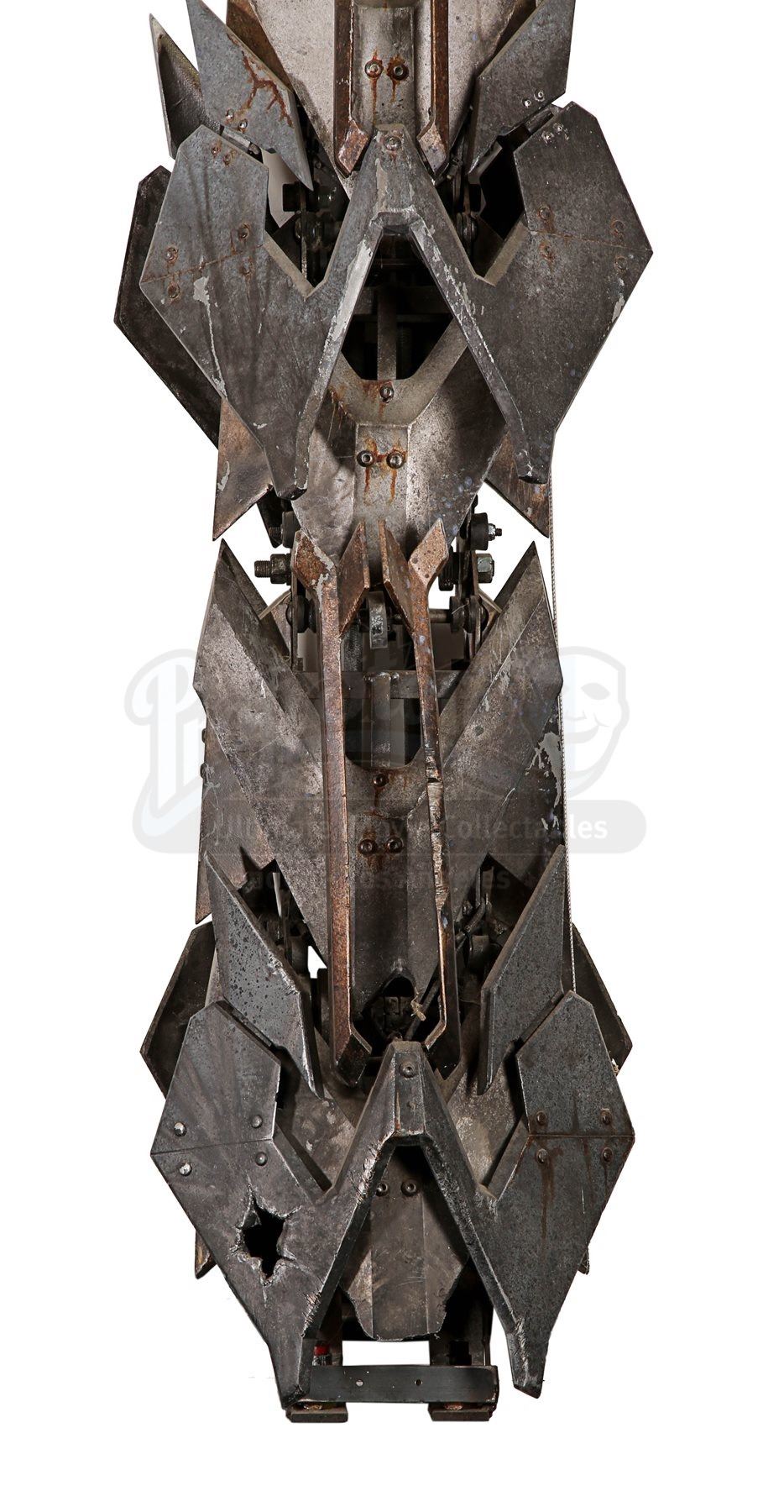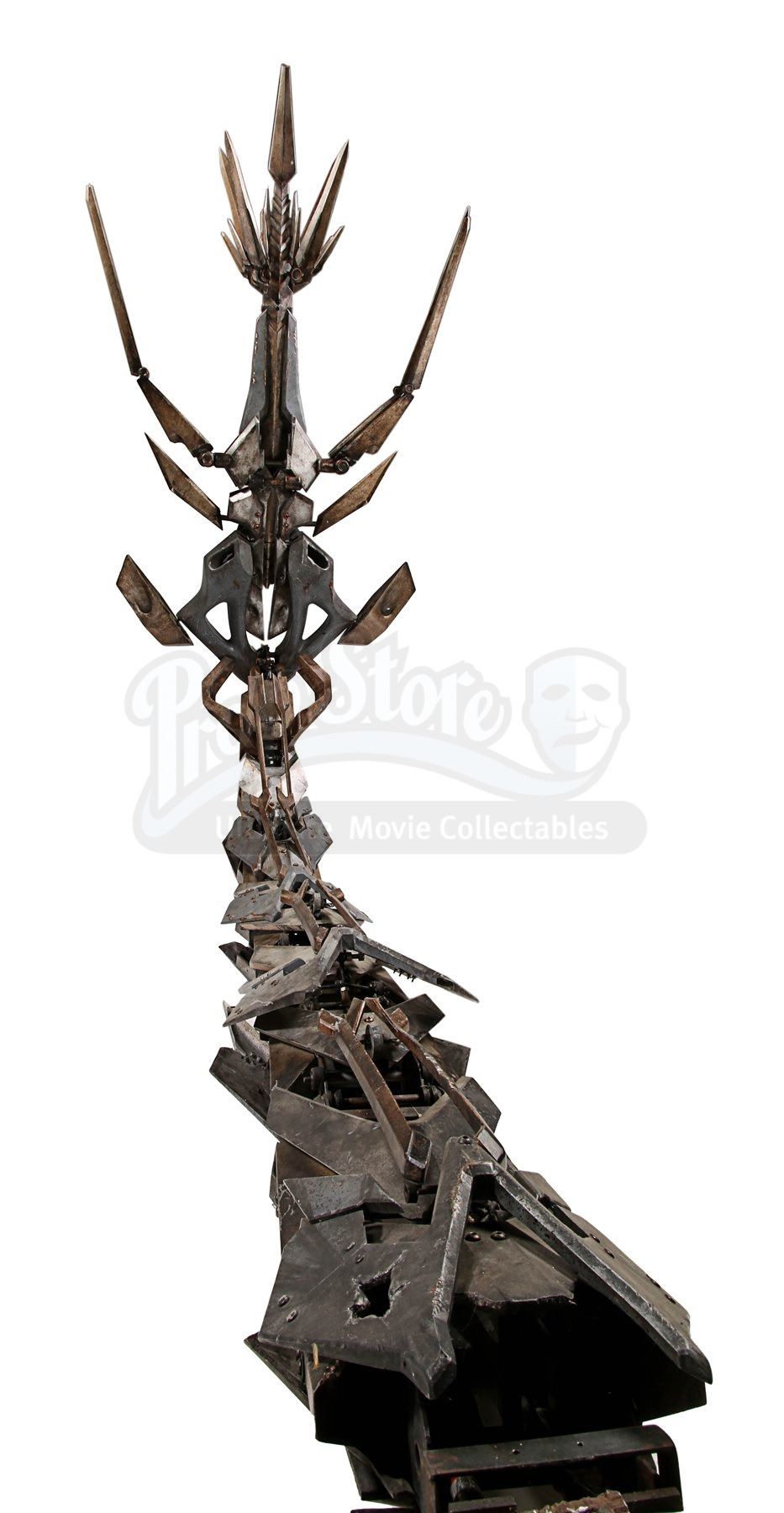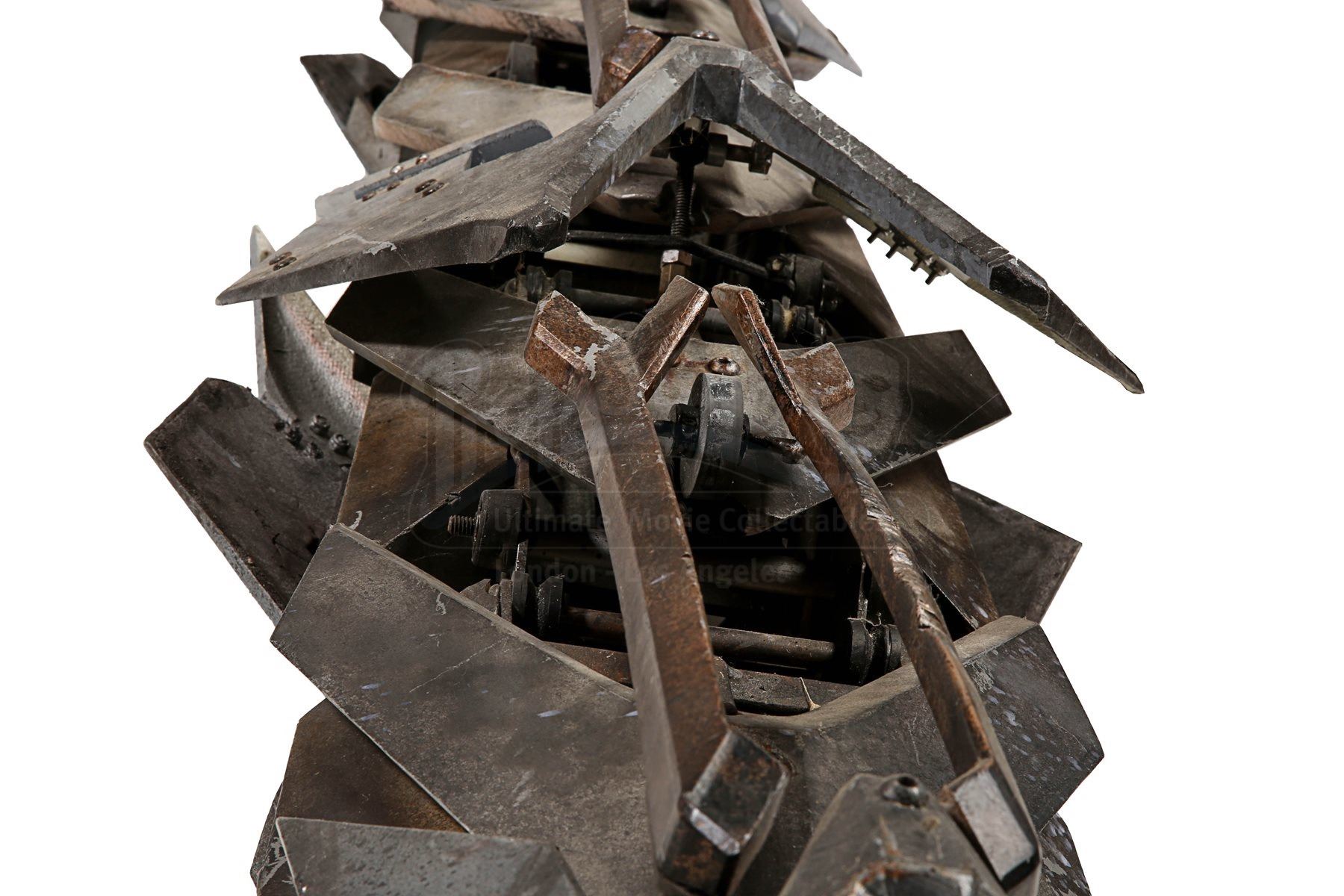 The full-size tail is built around multiple fastened steel segments, covered in similarly segmented fibreglass armour-plating that is decorated with metallic grey paint, dressed with rivets, and given scuffs and an aged patina. The tip of the tail features pointed mandibles. Running through the centre of the rig are lengths of steel cable and rope that allowed the puppeteers to curl and twitch the tail on set. It remains in very good condition. Dimensions: 350 cm x 85 cm (138” x 34”)