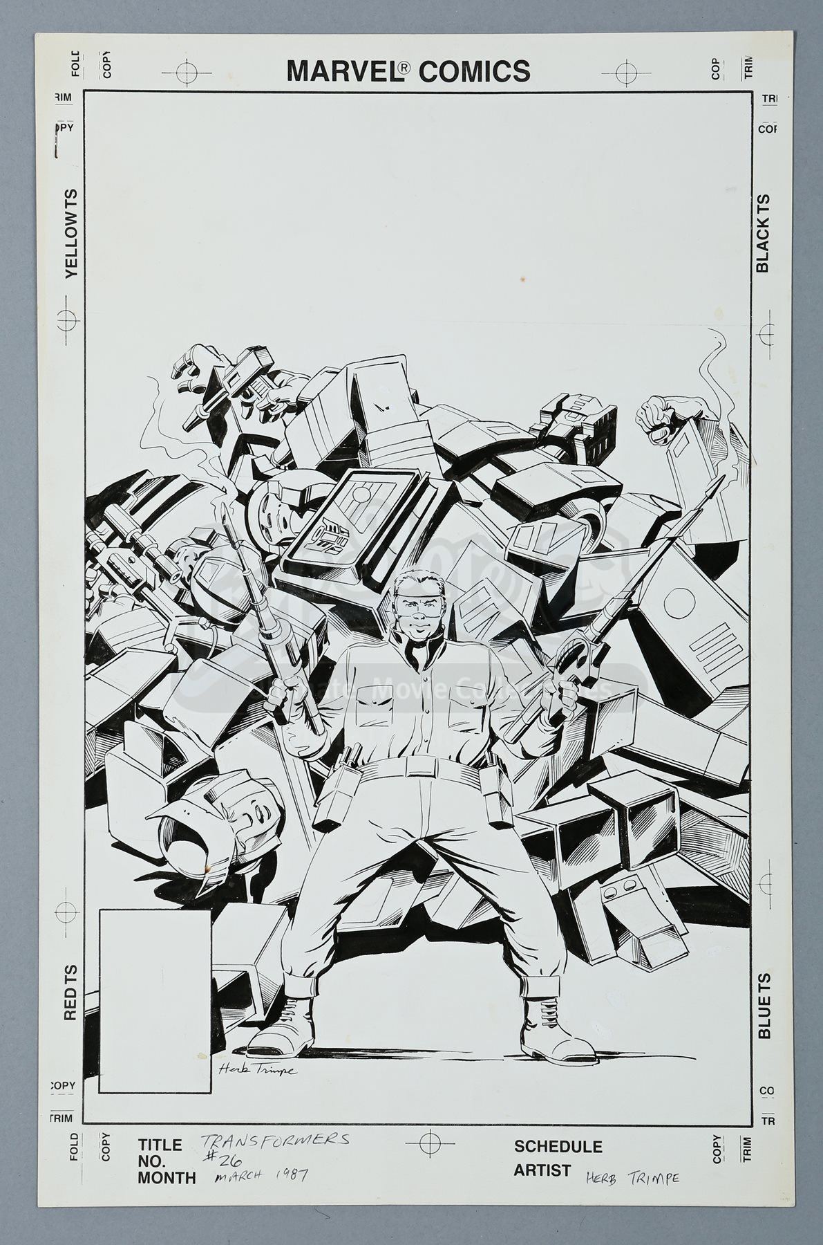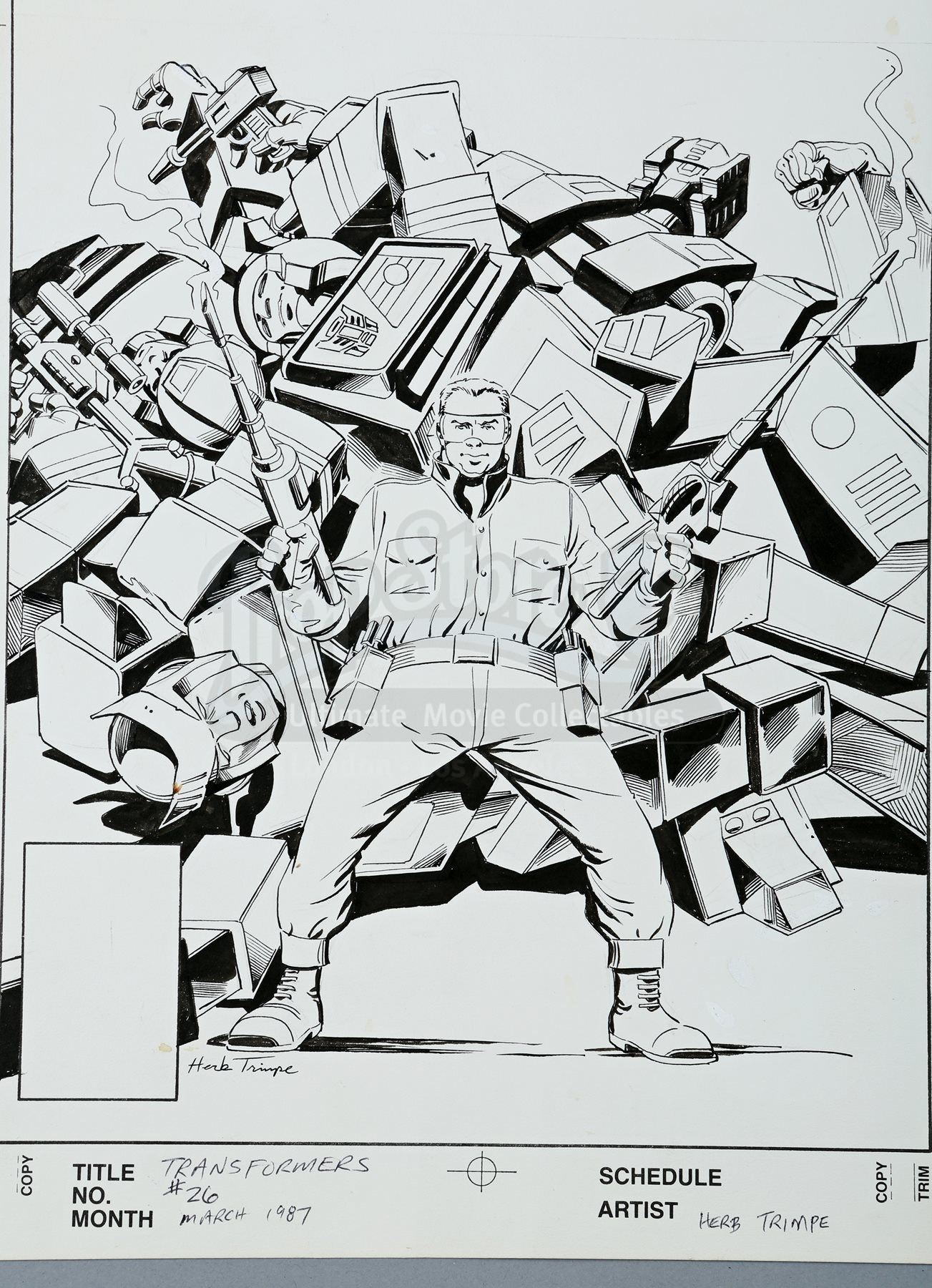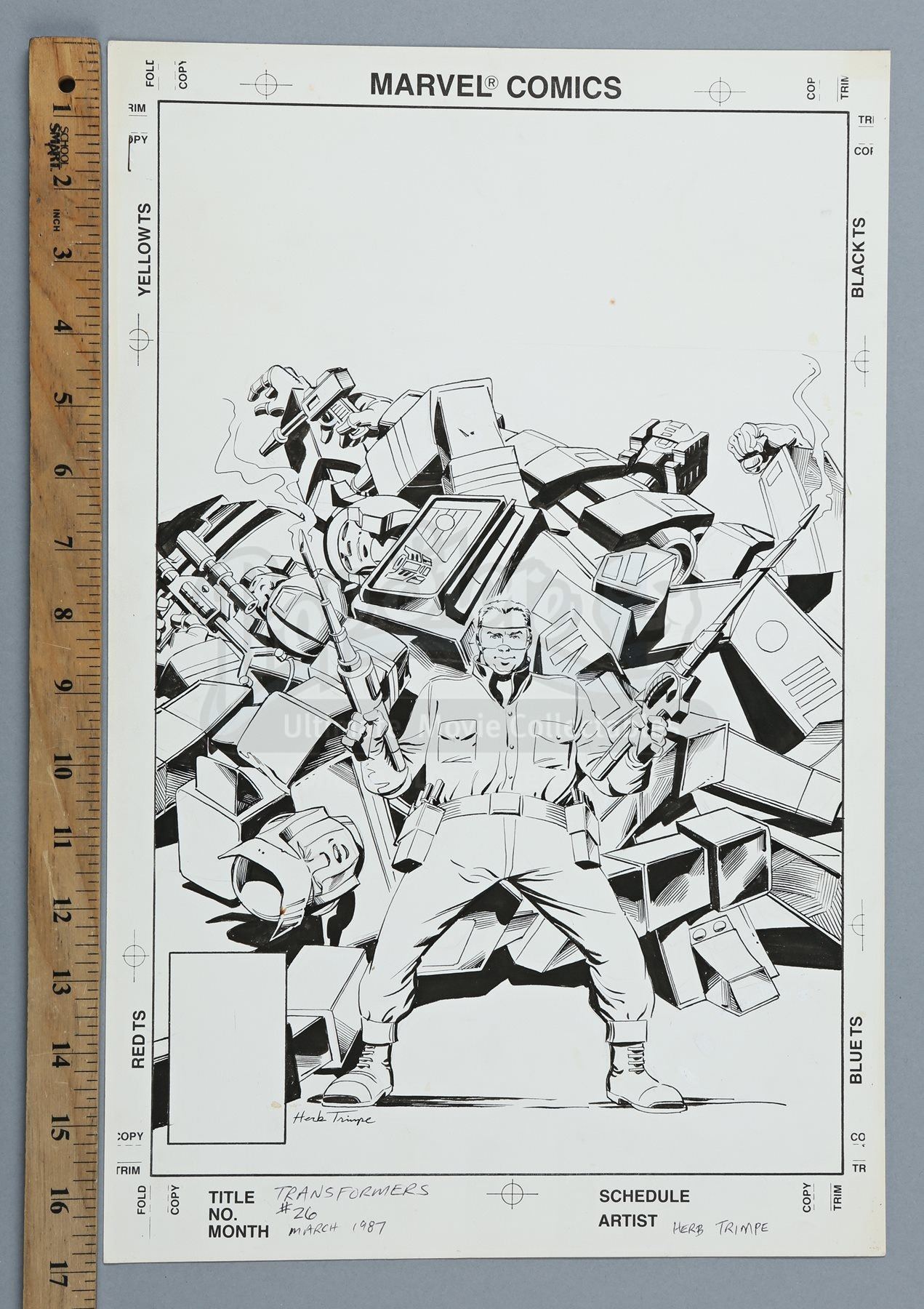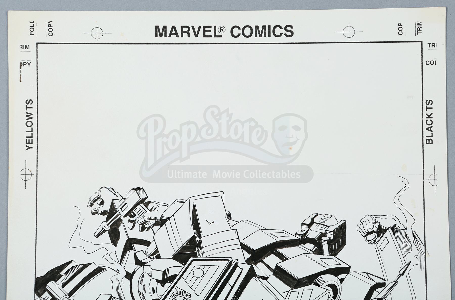 Included with the lot is a reference copy of Transformers #26, the comic book in which this art was originally published. Some white-out correction fluid is present and the board has a staple near the top left corner. The artwork is in very good condition. Dimensions: 43 cm x 28 cm (17” x 11”)