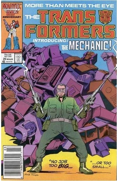 Hand-drawn cover artwork by Herb Trimpe featuring the introduction of the Mechanic for issue #26 of The Transformers. The cover shows the Mechanic brandishing dual rifles with a pile of fallen Autobots behind him.