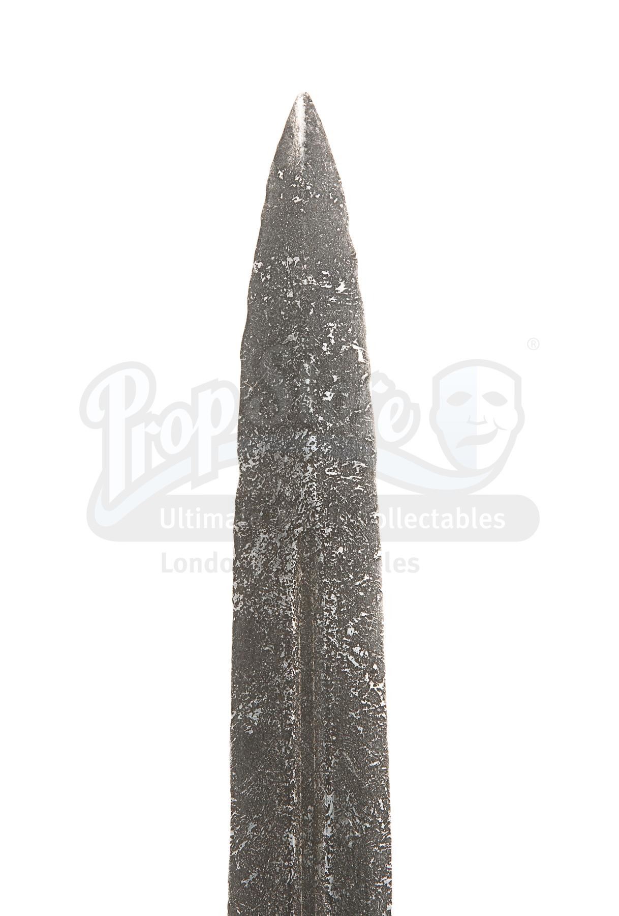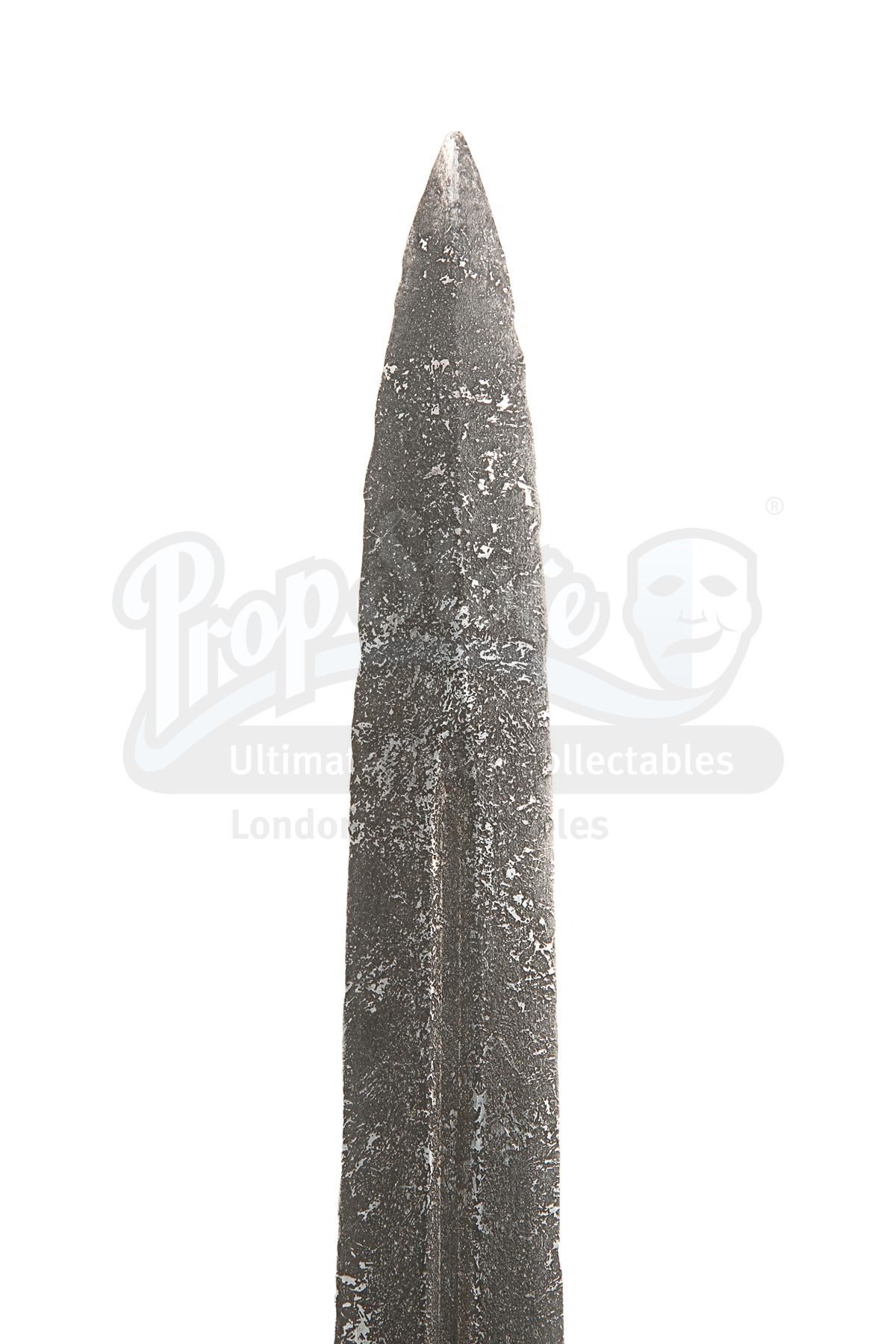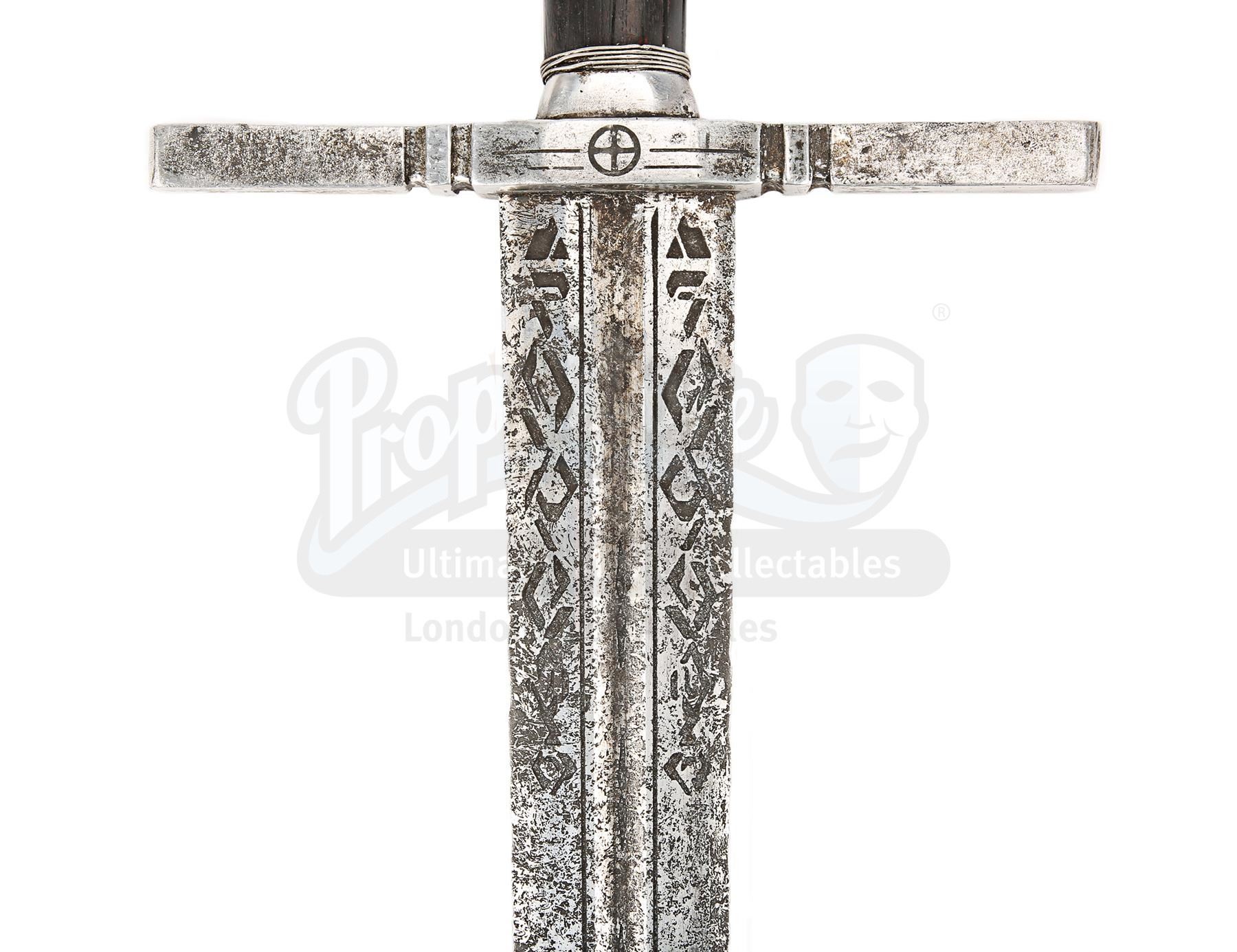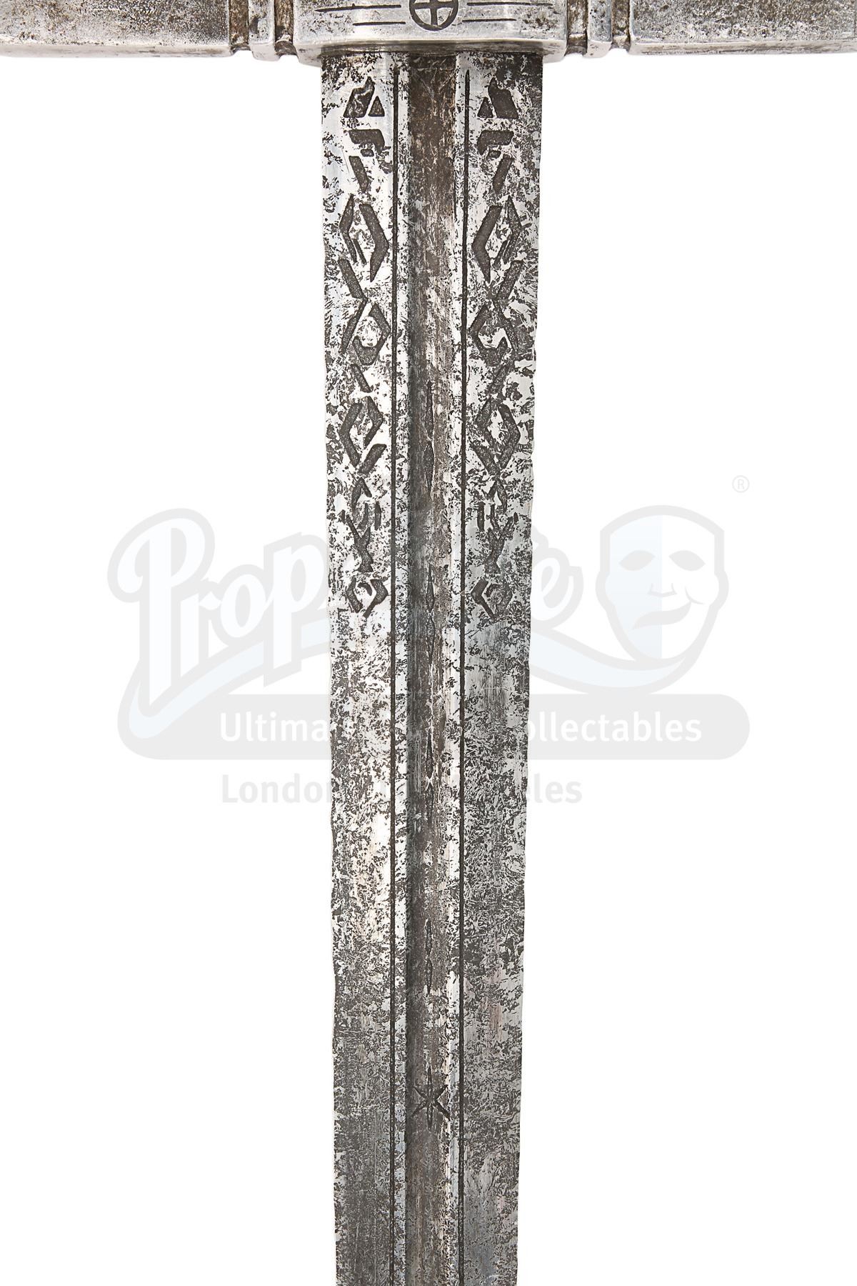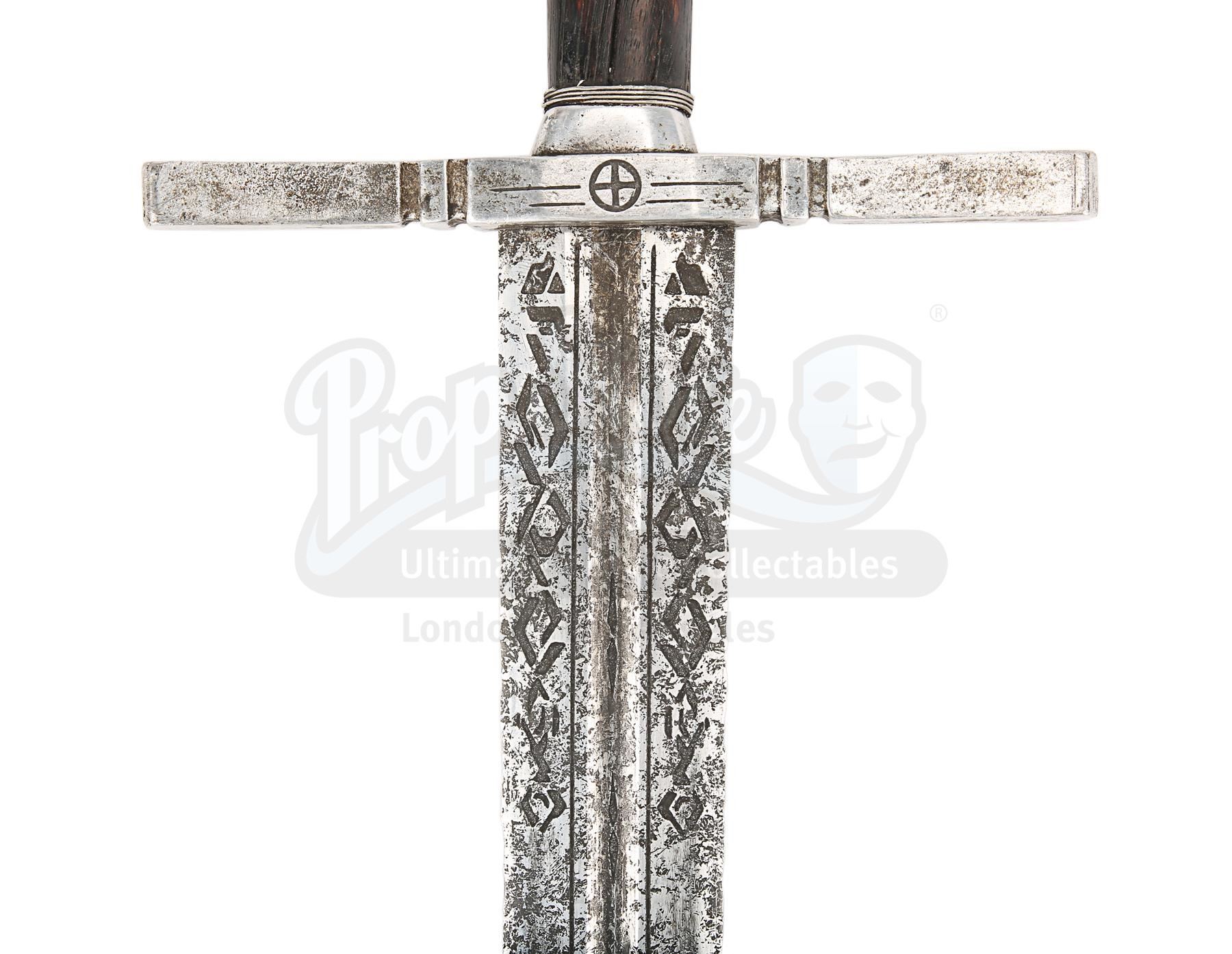 The sword is made of metal engraved with assorted symbols, textured and painted to give the appearance of tarnished steel. The handle is made of dark brown wood, and the pommel is made of metal cast into the shape of a cross. A weathering wash has been applied into the deeper parts of the pommel, adding to the sense of age and emphasising the intricate design. There are some slight signs of use and wear along the blade. Dimensions: 104 cm x 22 cm x 3 cm (41" x 8 3/4" x 1 1/4")