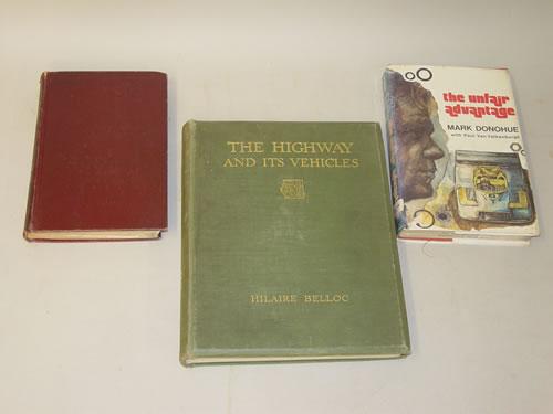 TRANSPORTATION. A Group of 3 Volumes as Listed. Hard Cover. Ex-Library. Good condition. **The History of the First Locomotives in America by William H. Brown (1871) 1st Edition, NY: D. Appleton & Co. 8vo in a library binding, Plates with text illustrations and 3 FOLD-OUTS (poorly taped, crease tears). **The Highway and Its Vehicles by Hilaire Belloc (1926) LIMITED #745/1250, London: The Studio Limited. 4to in original binding, bevelled edges, PLATES THROUGHOUT, B/W & CHROMOLITHOGRAPHS WITH TG's. Front hinge taped, binding tight. **The Unfair Advantage by Mark Donohue with Paul Van Valkenburgh (1975) NY: Dodd, Mead & Co. RACING. 8vo, original boards with DUST JACKET (plastic cover adhered to). covers show tape marks where DJ was taped down, binding and hinges tight. ILLUSTRATED, contents include Cobras, Lotus 20, Lola T70, McClaren M6-B and more.