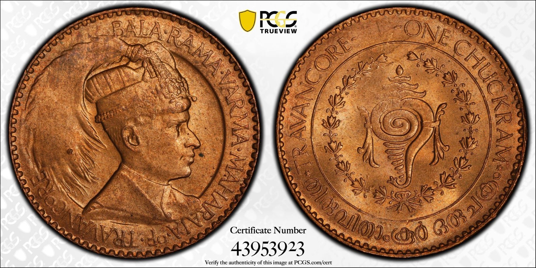 TRAVANCORE: Bala Rama Varma II, 1924-1949, AE chuckram, ND (1938-40), PCGS MS65 RB