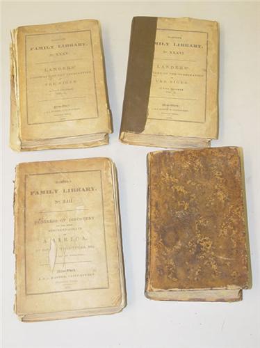 TRAVEL. A Group of 4 Volumes as Listed. 16mo - over 5¾" - 6¾" tall. Hard Cover. Ex-Library. Fair to Good Condition. ***A Pocket Gazatteer, or Traveller's Guide Through North America and the West Indies by Bishop Davenport (1838) Baltimore: Cushing & Sons. 468pp bound in leather with gilt decorated spine. Occasional foxing, binding tight. ***Progress of Discovery on the More Northern Coasts of America (1833) NY: J. & J. Harper. Complete with MAP (2 small tears), all plates & illustrations. Original cloth binding. Occasional foxing, front cover detached, cover worn, back hinge taped, lacks upper portion of backstrip. Binding tight, includes publisher ads. ***Journal of an Expedition to Explore the Course and Termination of the Niger: With a Narrative of a Voyage Down That River to Its Termination - 2 Volumes by Richard and John Lander. Complete with MAPS & PLATES. Folding map has a tear. Bound in original cloth, covers worn, one back cover detached, cloth over backstrips, bindings tight, includes publisher ads.