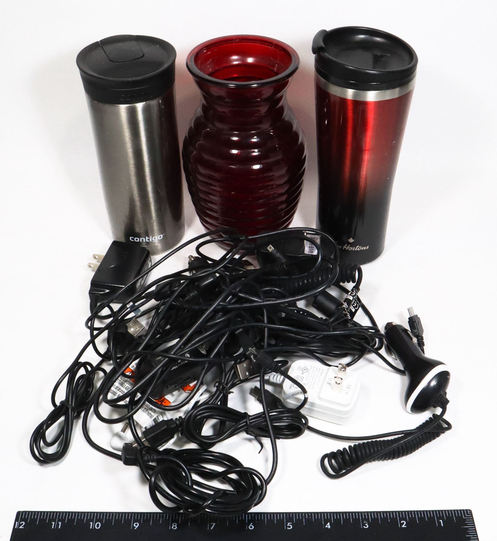 TRAVEL COFFEE MUGS, VASE, ASSORTED CHARGERS,