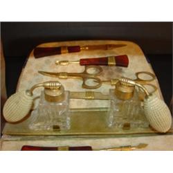 TRAVEL PERFUME & MANICURE SET. Book form case. Consists of two perfume bottles and 11 manicure tools. 8.25" L, 5.5" W, 2" H