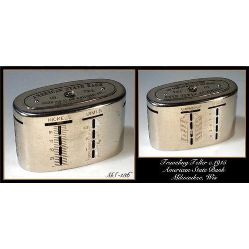 Very scarce and unique "Traveling Teller" stainless steel bank. It was the foolproof way to save money; only the bank teller had the key! This piece measures 3 5/8" wide x 1 3/4" deep x 2 3/8" high and is oval in shape. There are slots around all sides of the bank, each sized for a different coin, quarters, nickels, dimes, halves, and cents. The slots are marked so the value of the contents can be easily calculated. There is a round hole in the bottom for bills. The bottom of the bank is stamped: "The Traveling Teller", The Automatic Recording Safe Co., Chicago, U.S.A. Patented : April 26 1904, July 4 1905, April 25 1911, Sept 9 1913, Sept 23 1913. Issued by American State Bank, South 2nd. St. and W. National Ave., Milwaukee, WIS. This bank is marked No. 721 and is in fine condition, no dents some minor surface scratches. Don't miss this opportunity to have this bank for your collection! For Ebay Live Auctions photo sizes are automatically reduced (and distorted), so if you want to see larger more detailed pictures, please email us.