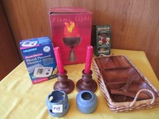 TRAY, CANDLE HOLDERS, BLOOD PRESSURE MONITOR, FLAME LIGHT, ETC