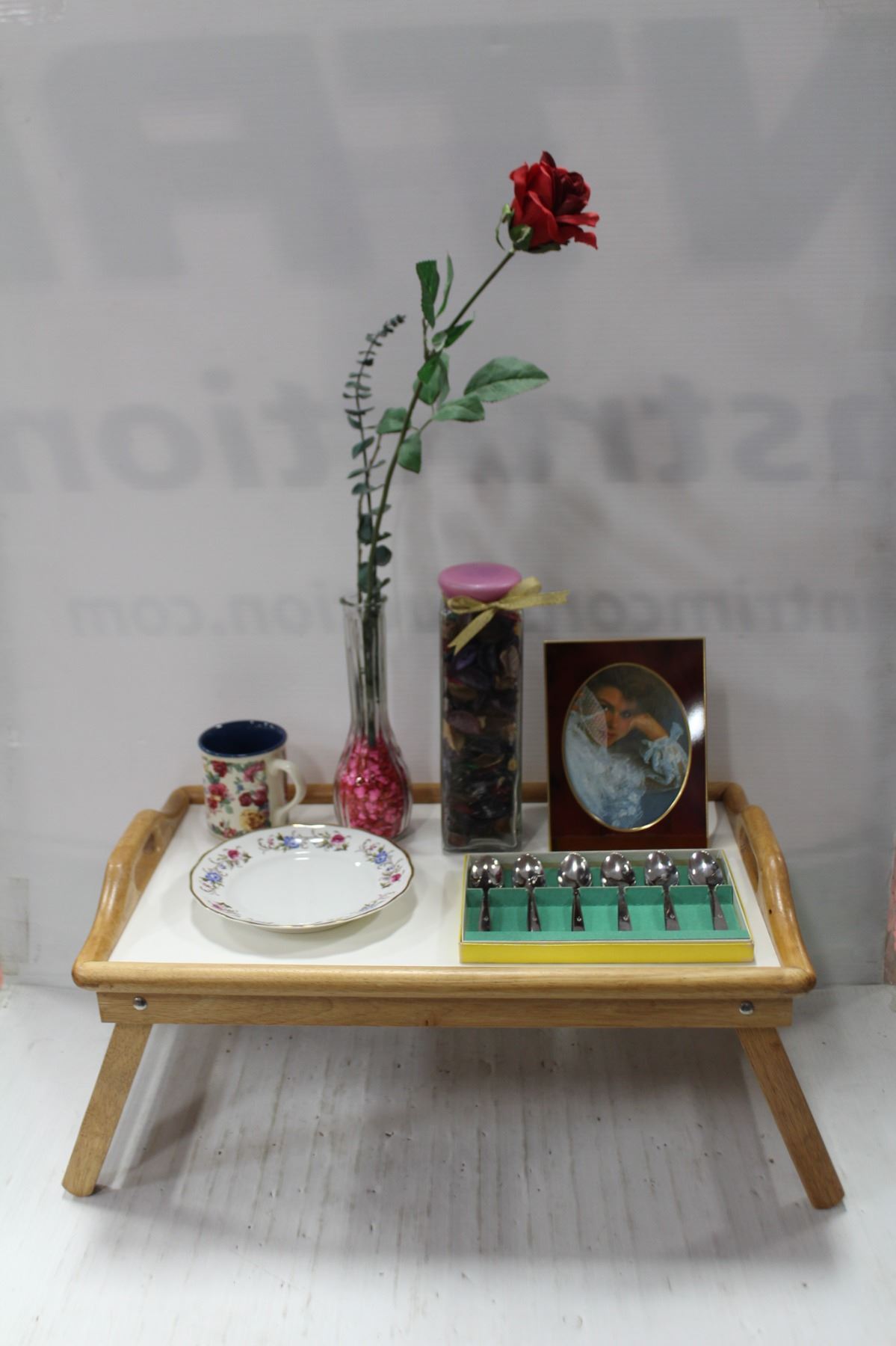 SERVING TRAY WITH ROSE IN A VASE WITH A FLORAL CUP AND PLATE WITH VINTAGE GRAPEFRUIT SPOONS WTH POTPOURRI AND A PICTURE FRAME