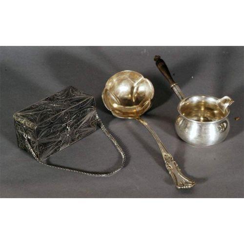 TRAY LOT OF SILVER, filligree purse, ladle and porringer, 575 grams total weight. CONDITION REPORT: no damage or restoration PACKING AND SHIPPING provided by Fairfield Auction (within the Continental U.S. excluding insurance- which will be required and added) $30