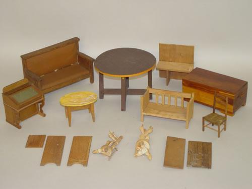TRAY LOT WOODEN DOLL FURNITURE TO INCLUDE CEDAR CHEST SETTEE, DAVENPORT DESK, ETC.