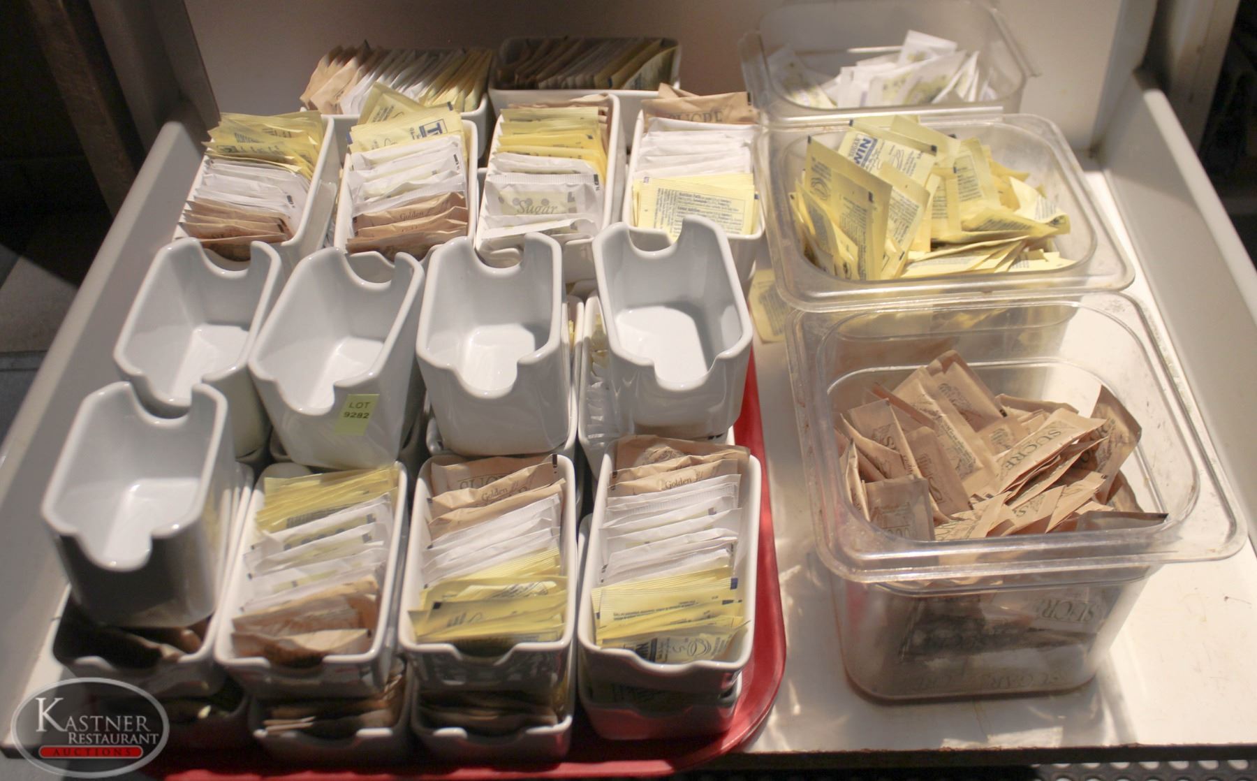 TRAY OF 37 SUGAR CADDIES WITH SUGARS