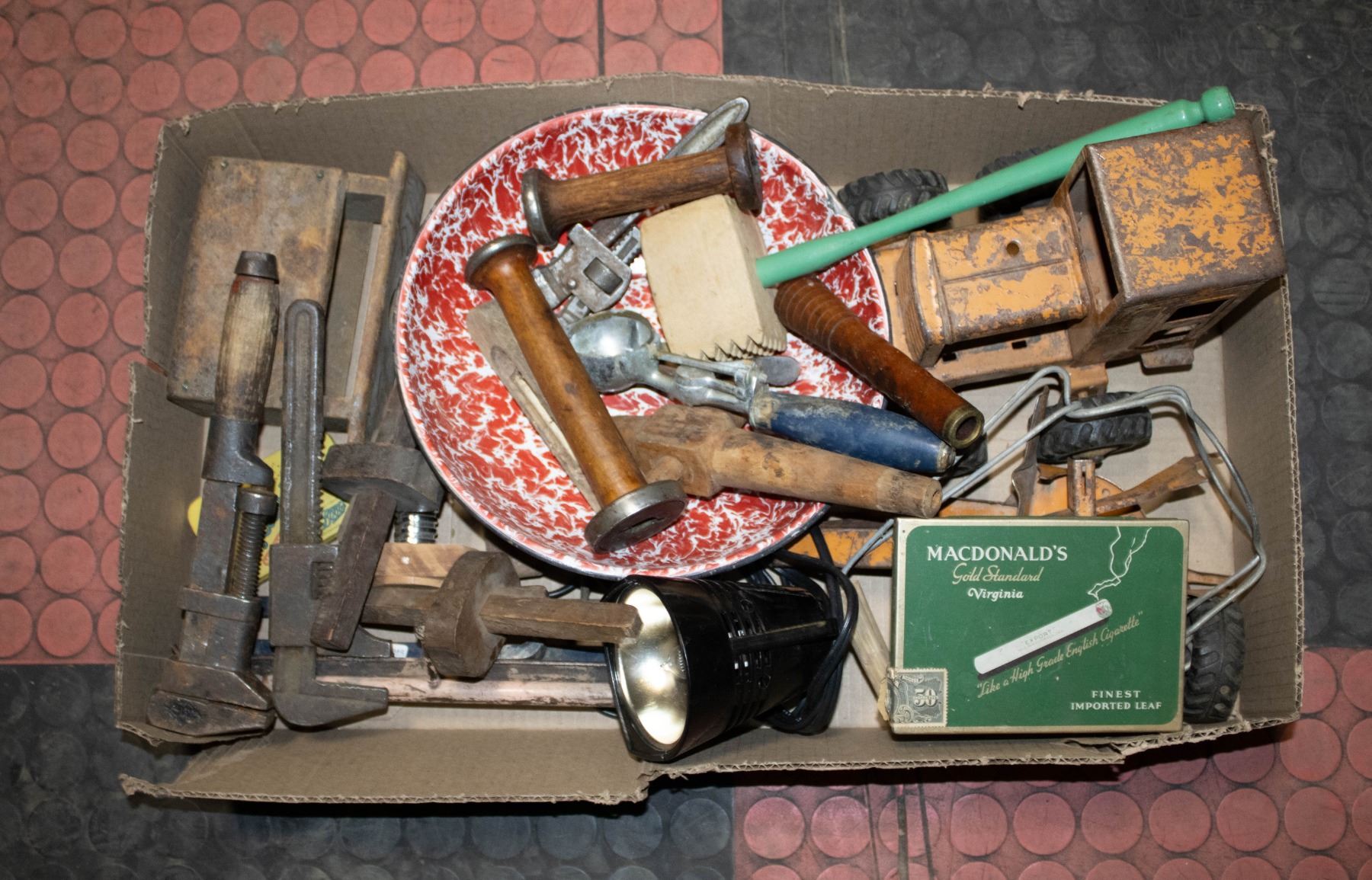 TRAY OF ANTIQUE TOOLS, TOYS & ETC.