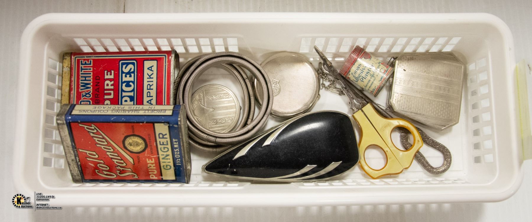 TRAY OF ANTIQUE/VINTAGE COSMETIC PALETTES, SPICES,