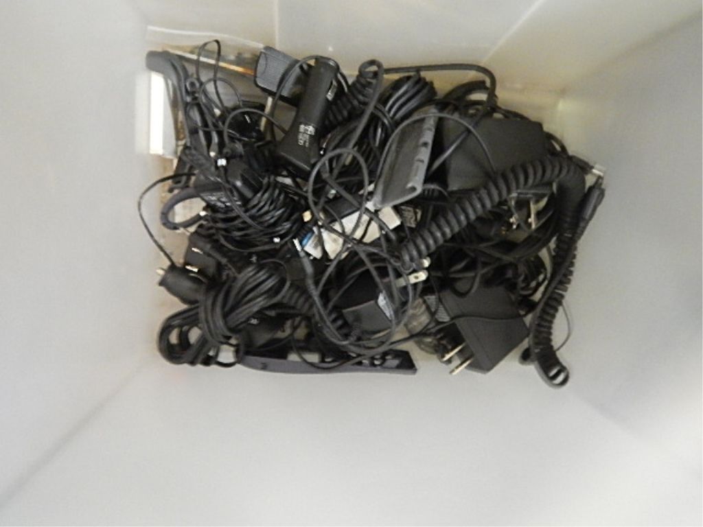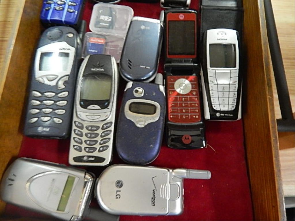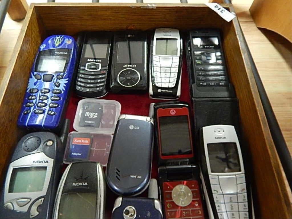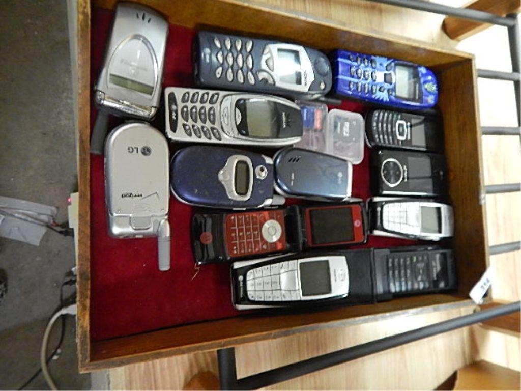 TRAY OF ASSORTED CELL PHONES - INCLUDES BOX OF CORDS, BATTERIES ETC