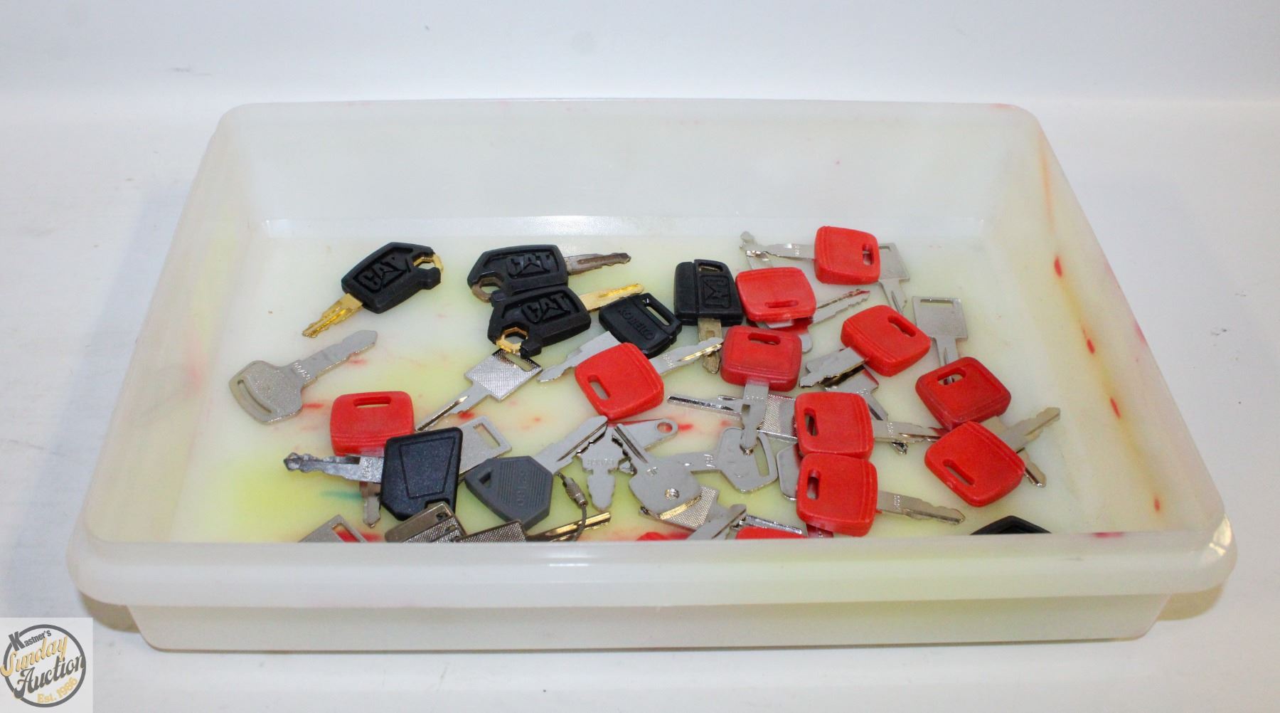 TRAY OF ASSORTED EQUIPMENT KEYS, JOHN DEERE, CAT,