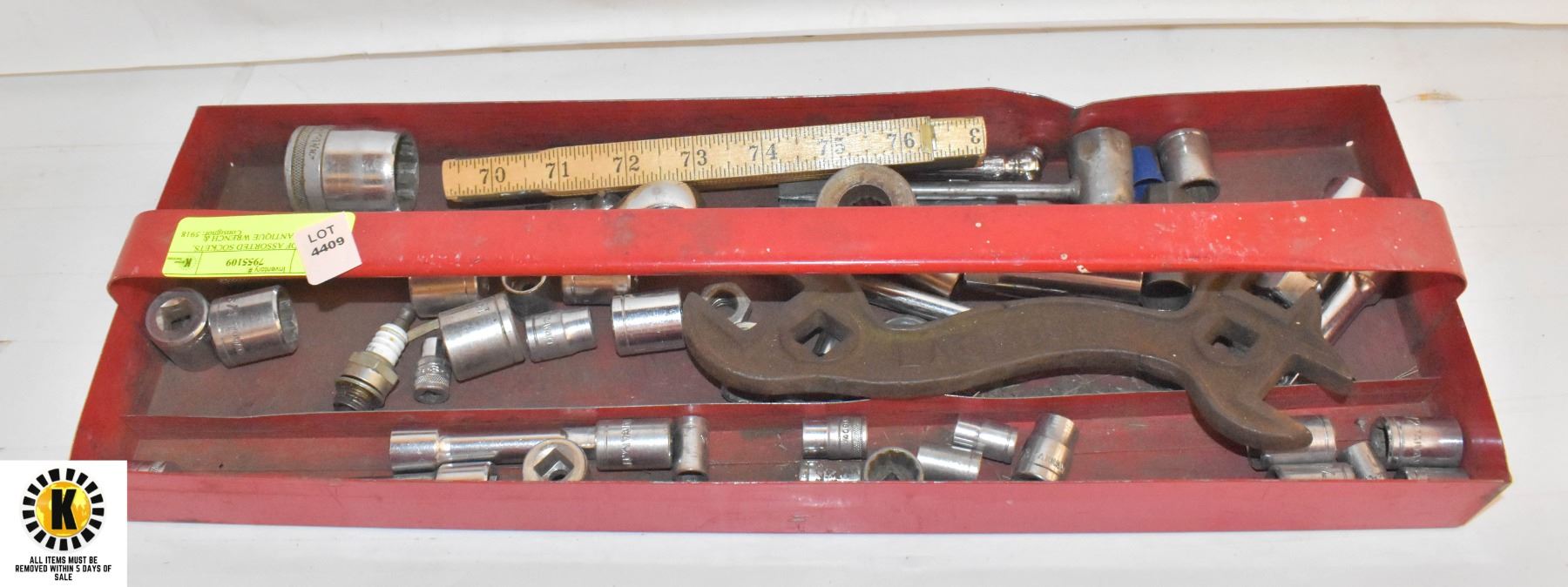 TRAY OF ASSORTED SOCKETS, TOOLS, ANTIQUE WRENCH &