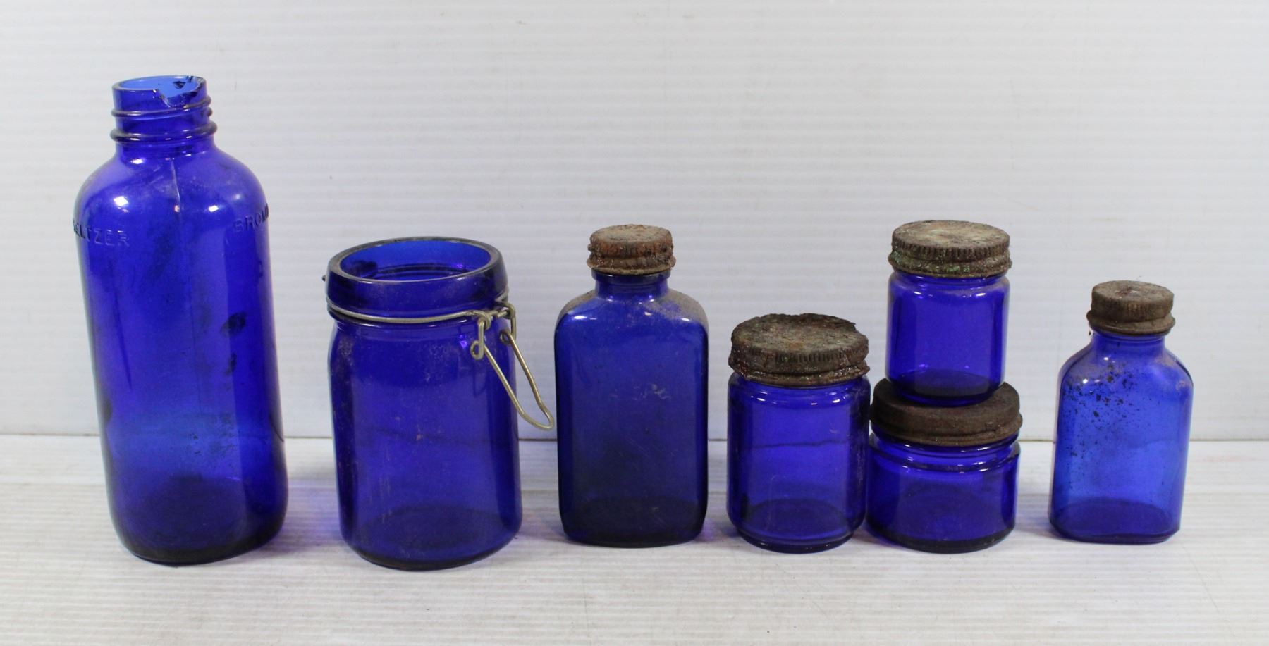 TRAY OF ASSORTED BLUE GLASS BOTTLES