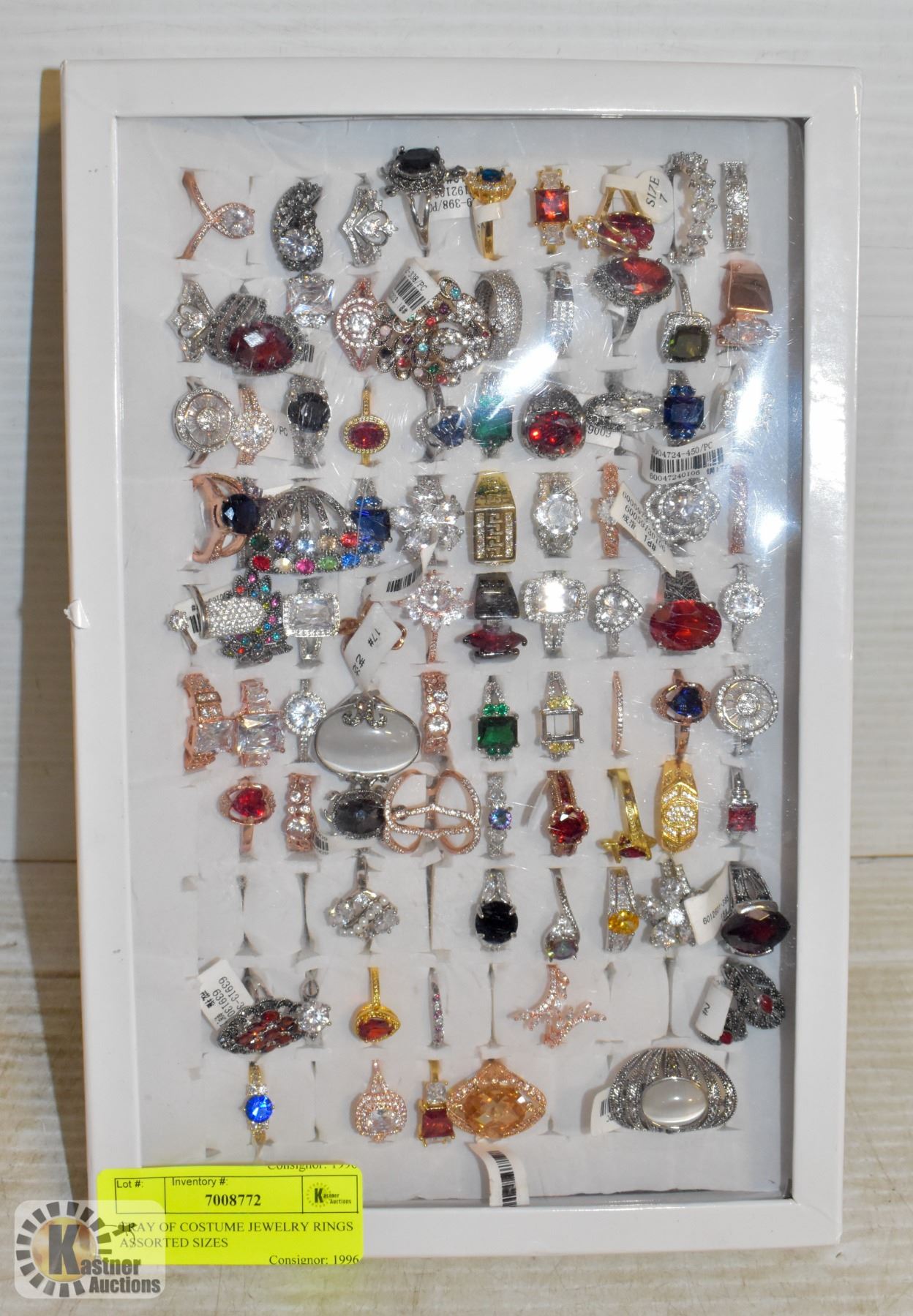 TRAY OF COSTUME JEWELRY RINGS ASSORTED SIZES