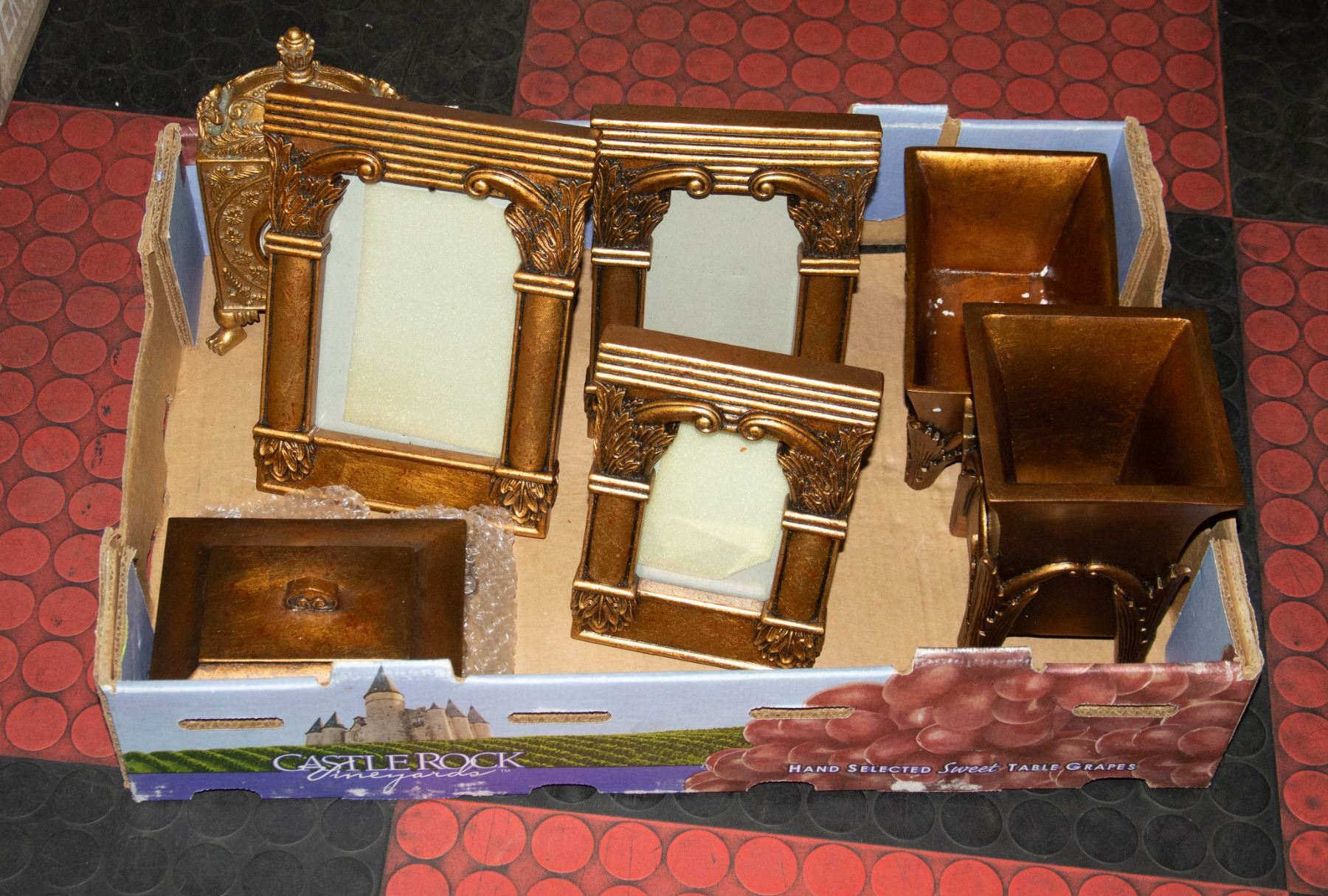 TRAY OF HOME DECOR IN GOLD COLOUR INCLUDES CLOCK,