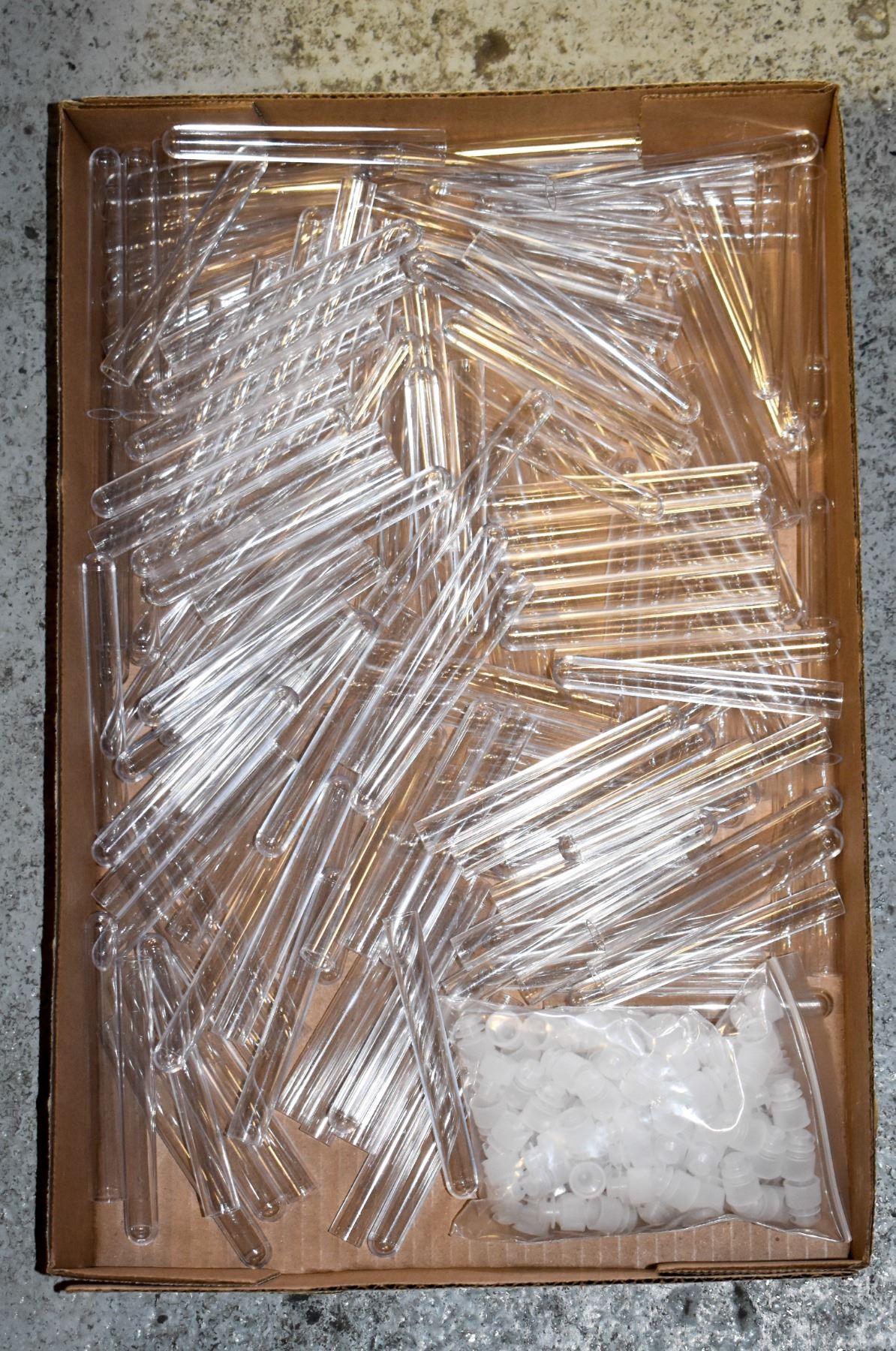 TRAY OF PLASTIC VIALS WITH CAPS.