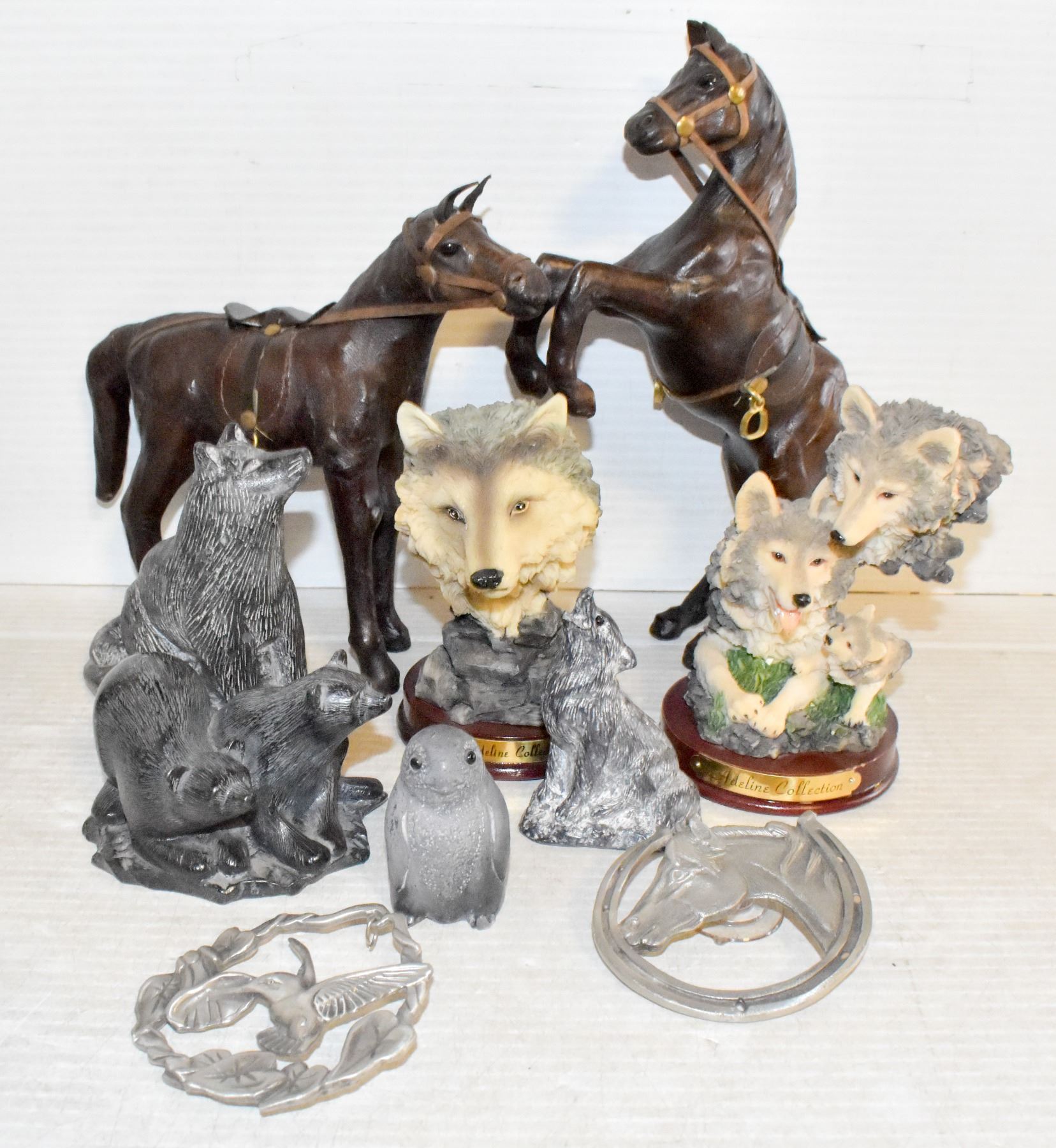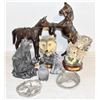 TRAY OF WOLF CARVINGS AND HORSE AND WOLF ORNAMENTS