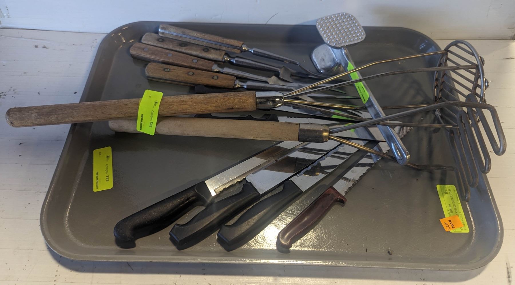 TRAY W/ POTATO MASHERS, FORKS, TENDERIZER &