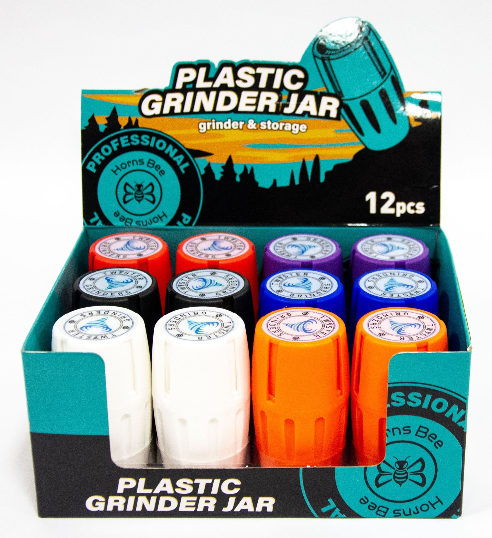 TRAY WITH 12 NEW PLASTIC GRINDER JARS