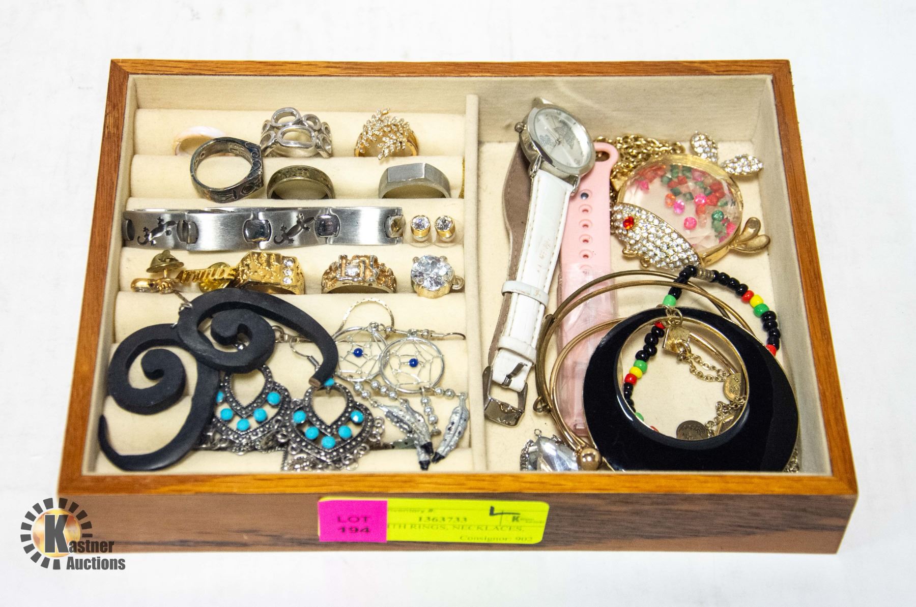 TRAY WITH RINGS, NECKLACES, WATCH,
