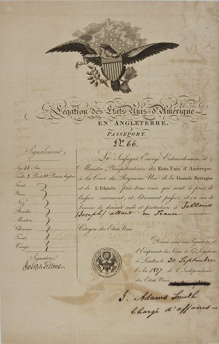 ROBERT WERE FOX (1754-1818) American merchant and diplomat, Consul of the United States at Falmouth. Good content A.L.S. as Consul with integral address leaf, 2pp. 4to., Falmouth, Oct. 5, 1801 to powerful American diplomat ROBERT R. LIVINGSTONE in Paris. As a peace treaty between France and England was being negotiated, Fox, in the port city of Falmouth, writes in part: "...Having just learned the great and joyful news of Preliminaries of Peace being signed...I take the liberty of addressing thee on behalf of my brother Thomas Were Fox...for the Appointment of their Agent at Falmouth...for assisting such of their Ships ot Subjects...". Marginal tear, else very good. Sold with: an engraved passport, 1p. sm. folio, London, Sep. 30, 1817, in French, issued to Joseph Fellows and signed by J. ADAMS SMITH, Charge d'Affaires; an 1815 British safe conduct pass issued to an American lady; a copy of the Calcutta Gazette, 1p. sm. folio, Oct. 6, 1809, announcing a treaty between Spain and Great Britain; and unrelated correspondence. Overall very good.