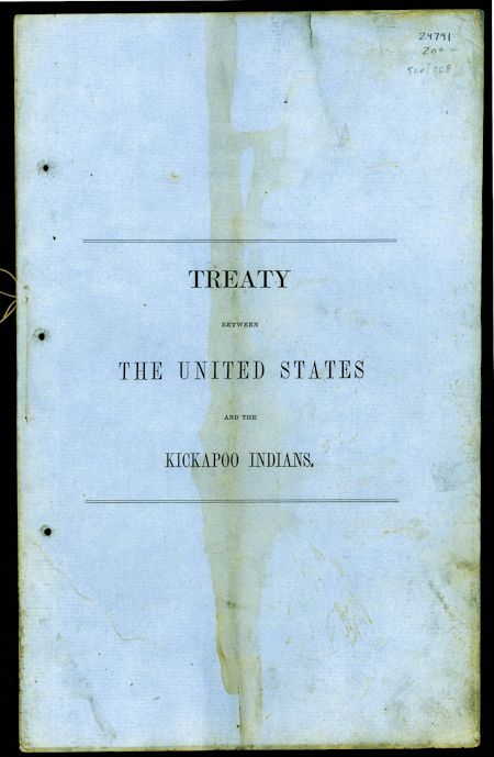 Scarce printed treaty, 8pp. legal folio, Washington, May 18, 1854, signed in type by Franklin Pierce, William L. Marcy, and five Kickapoo Indian delegates. In the treaty, the Kickapoo agree to sell to the U.S.: "...At least twelve hundred square miles...saving and reserving in the western part thereof, one hundred and fifty thousand acres for a future and permanent home..Provided, that upon return home of the delegates...a location to that extant can be found...United States agree to pay to the Indians...the sum of three hundred thousand dollars...one hundred thousand dollars to be invested...the interest of which shall be annually expended for educational and other beneficial purposes...all roads and highways...shall have right of way through the reservation...The Kickapoos promise to use their best efforts to prevent the introduction and use of ardent spirits [alcohol] in their country...commit no depredation or wrong...". Dampstained, yet remains entirely legible and acceptable.