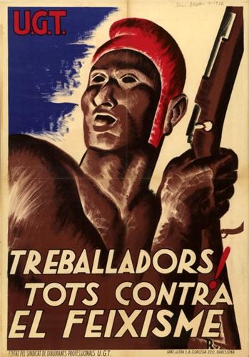 SINDICAT DE DIBUXANTS. TREBALLADORS! TOTS CONTRA EL FEIXISME. 1936. 100x70cm. (40x27in.). Litografía. A-.