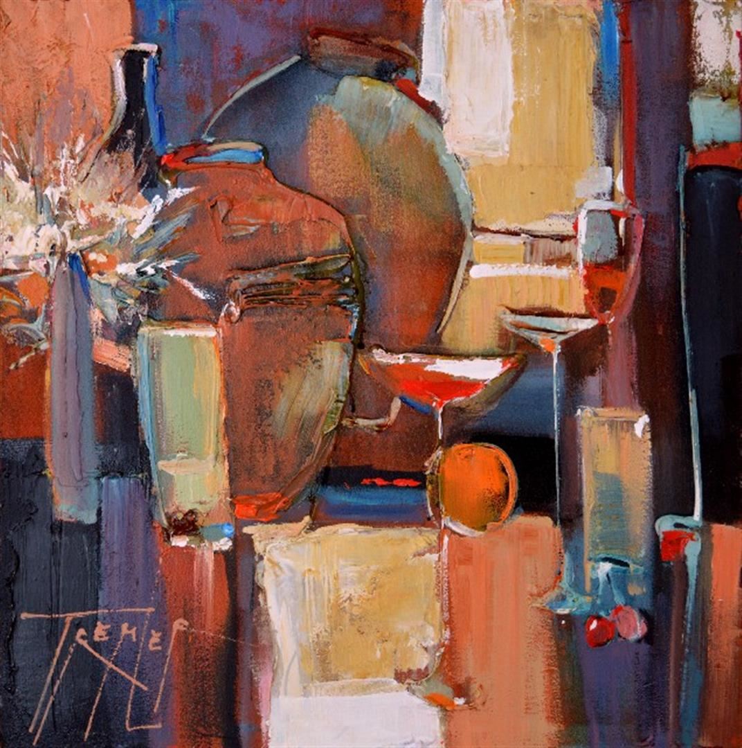 TREMLER **BAR STILL LIFE** ORIGINAL ACRYLIC. Artist: Yuri Tremler (b. 1961) - Title: Bar Still Life - Medium: Acrylic on Canvas - Signature: This one-of-a-kind work is hand-signed by the artist at the bottom of the image - Image Size: Approximately 24 ¼ inches x 24 inches - Framed: Stretched and Ready to Hang or Frame - Details: This work comes with a Certificate of Authenticity - Biography: Yuri Tremler (born Yuri Trembovler) was born in the Ukraine in 1961. He attended the College of the Arts in Kharkov. He later continued his studies at the Kharkov Art & Design Academy as well as at the Gall Design School in Germany. After that, he returned to Kharkov and worked as a metal smith theater decorator. Tremler immigrated to Israel in 1996 where he worked in crafts, industrial design, interior design, jewelry design, and participated in many exhibitions. After exploring new media to work within, he finally decided to dedicate himself almost exclusively to painting in 1998. The artist's striking and spontaneous palette clearly expresses a gamut of emotional states and moods. The images in his masterful works saturate the emotions and remain in the imagination. His works are now exhibited in galleries and art shows throughout Israel and the United States. - Warranty: Item GUARANTEED to be as described