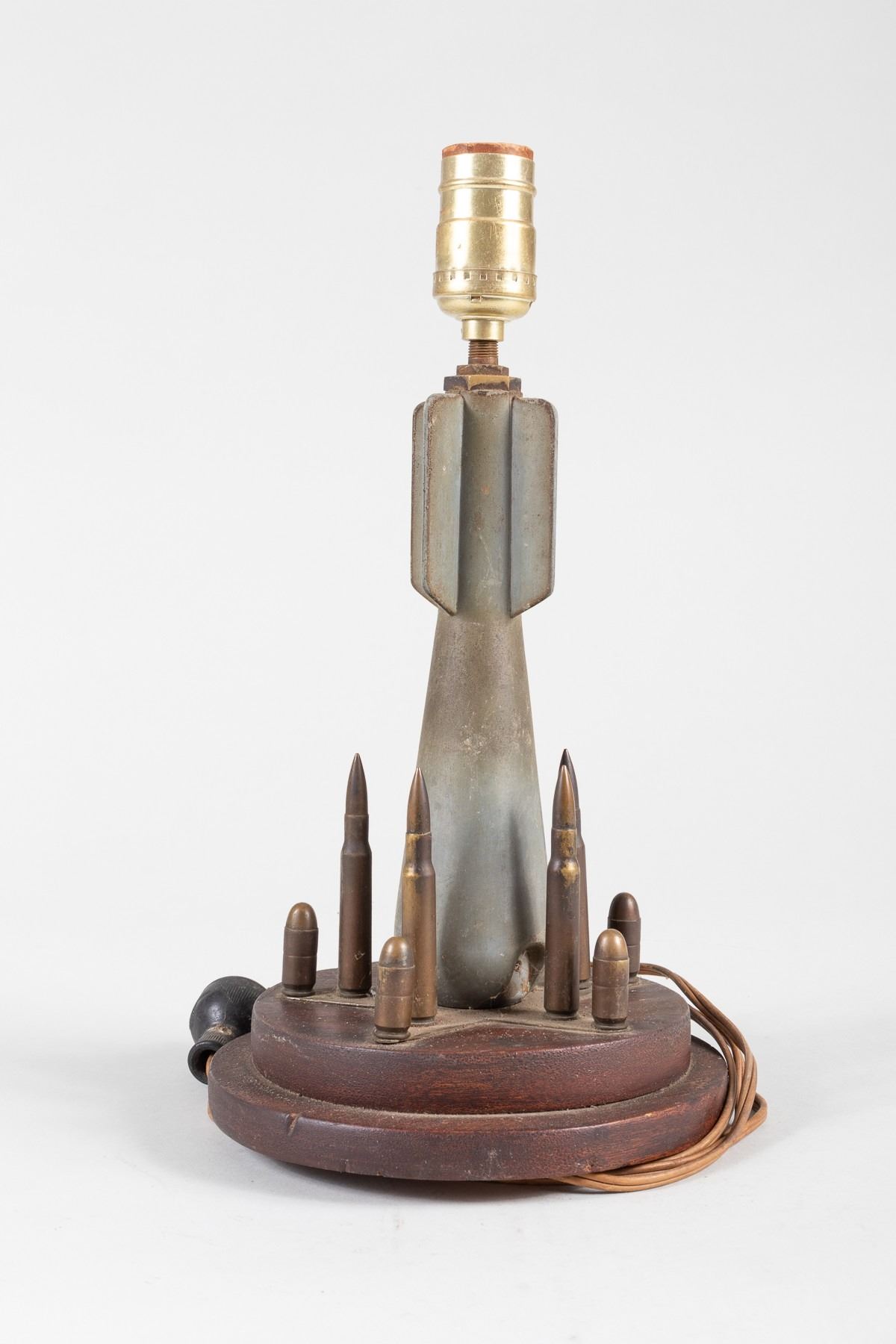 Trench art lamp stand adorned with bullets and rifle casings and the pillar being a mortar shell. 13.25 inches tall. 7 inches diameter at base. Not tested.