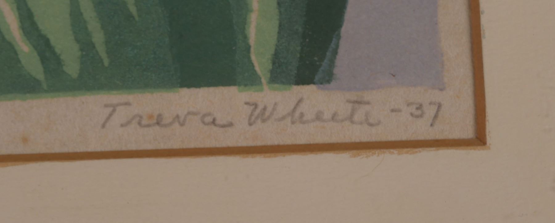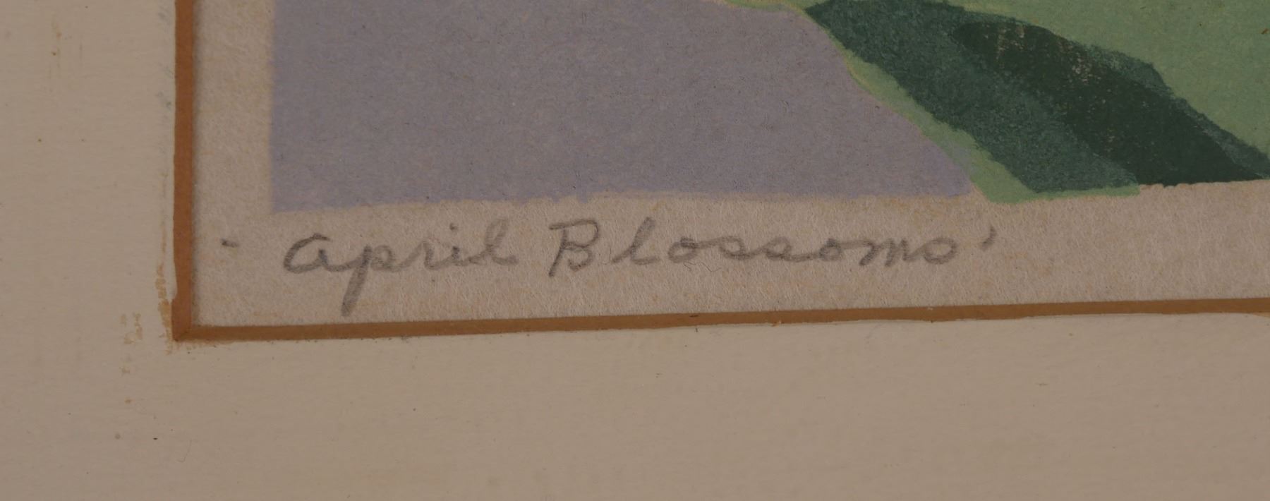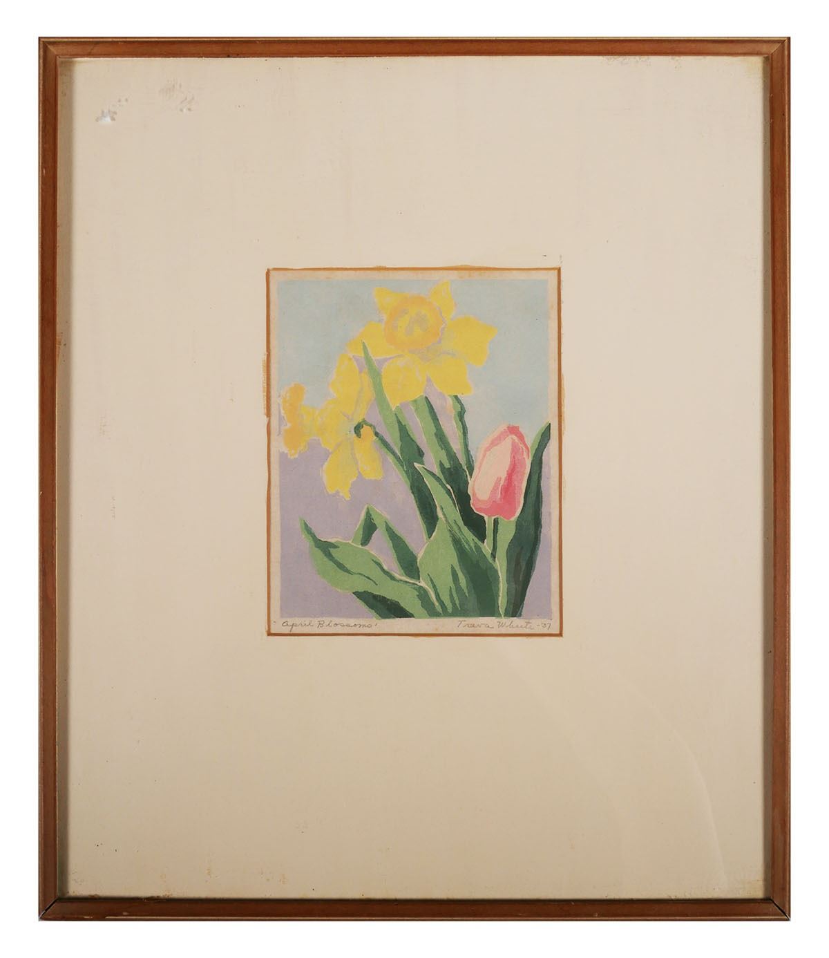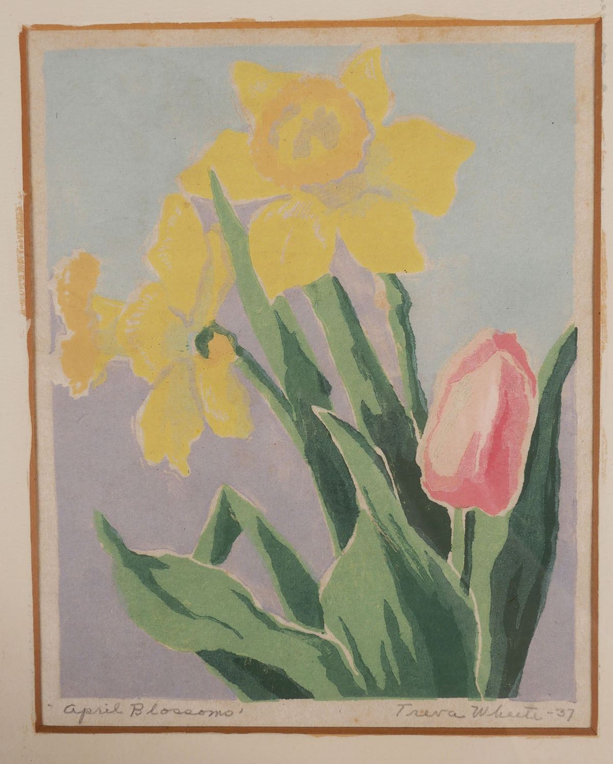 Floral woodblock print on paper by Treva Wheete (American, 1890-1963). Titled "April Blossoms," signed and dated in pencil in lower margin. Image measures 5" x 6 1/2", framed to 14" x 16". Excellent condition.