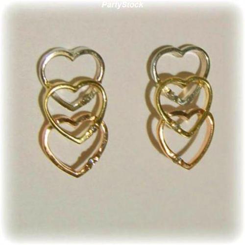 3 Hearts of Solid 14 Karat Gold are fused together! A White gold heart, followed by a second, Yellow gold heart, is followed by a third, Rose gold Heart. Diamond cuts in the hearts create sparkle when worn! The post for a pierced ear is located at the top of the top heart, so they hang below the earlobe when worn.